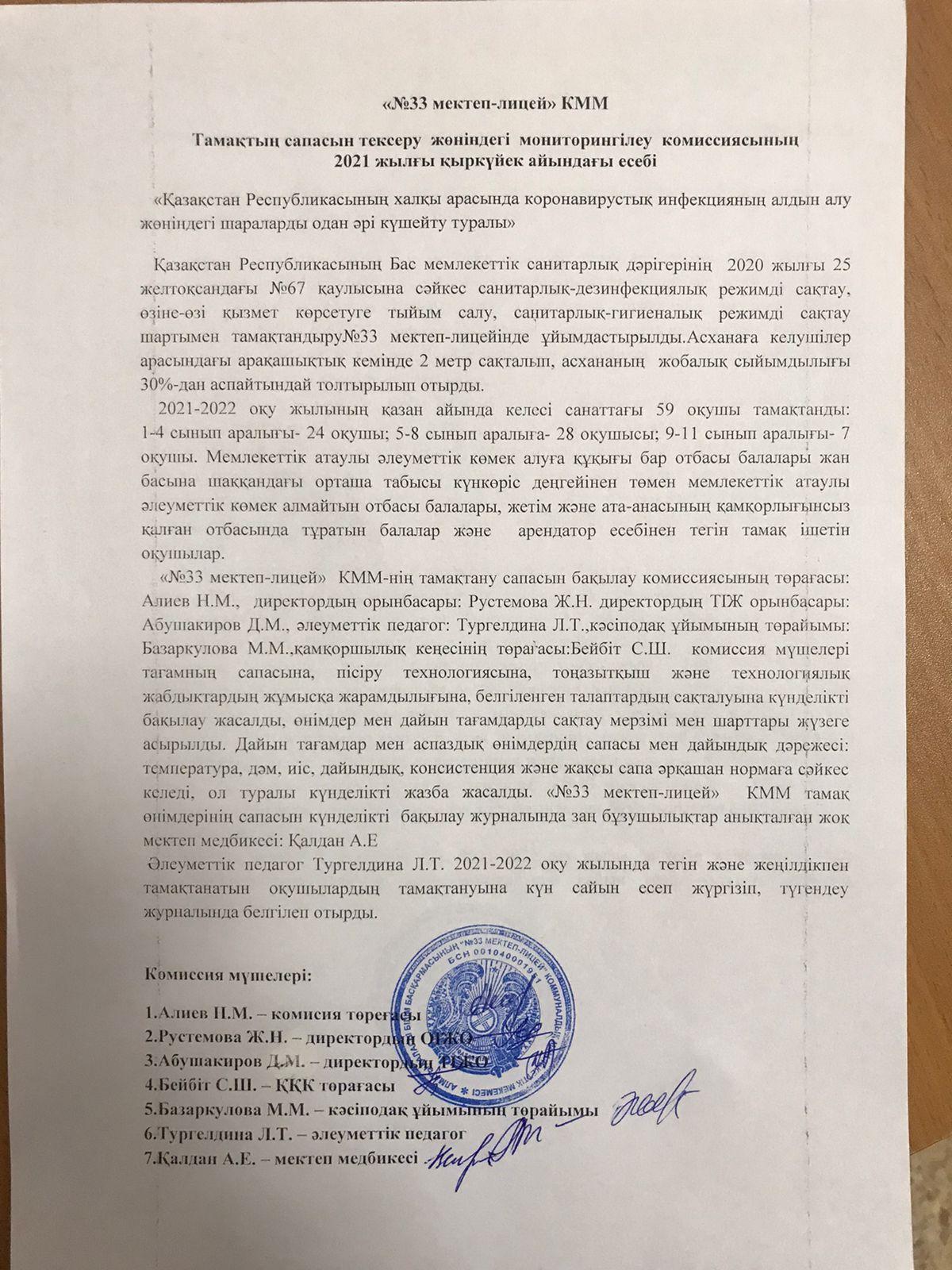 №33 мектеп-лицей 2019 жылдың ІІІ-тоқсанында тамақтандыруды ұйымдастырудың сапасына жасалған мониторингінің есебі