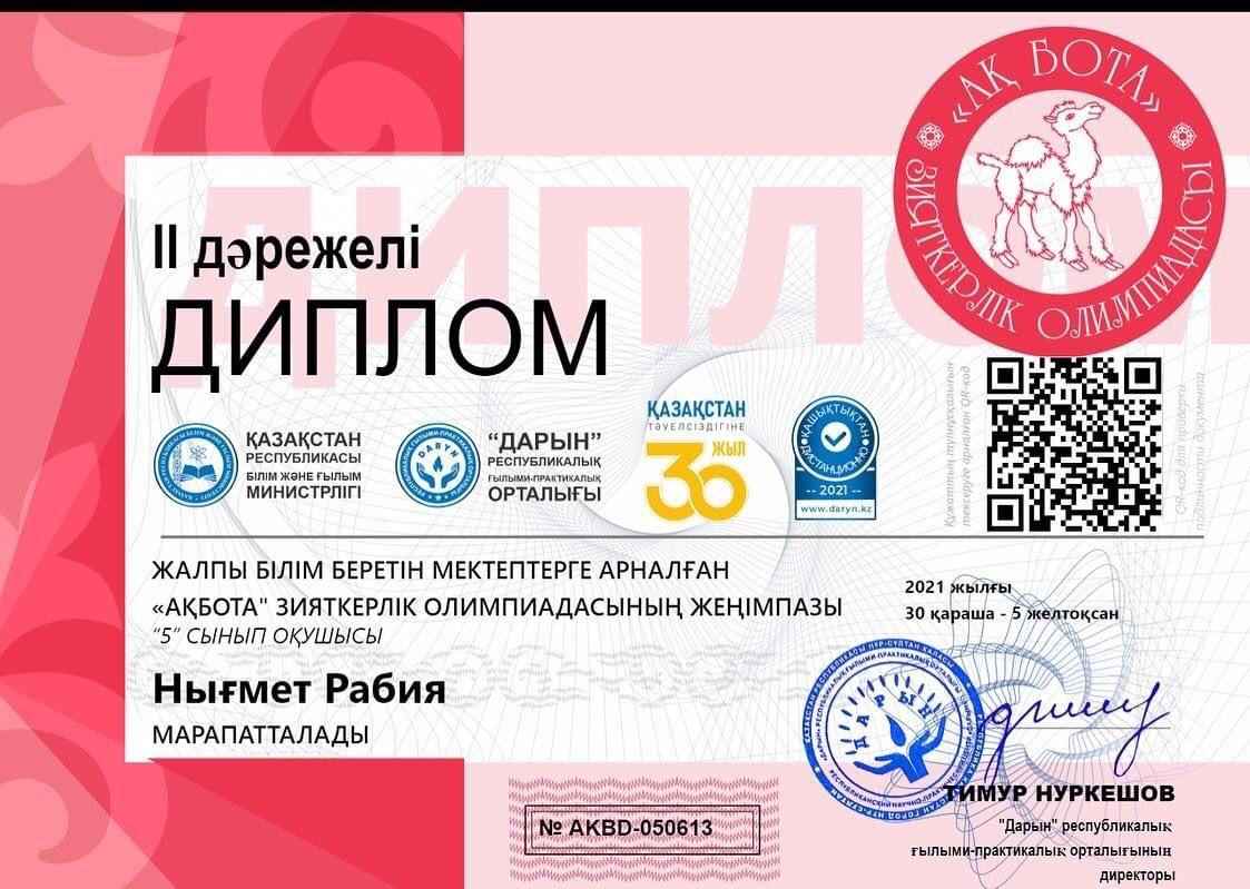 5Б сынып оқушысы Нығмет Рабия, II-дәрежелі диплом