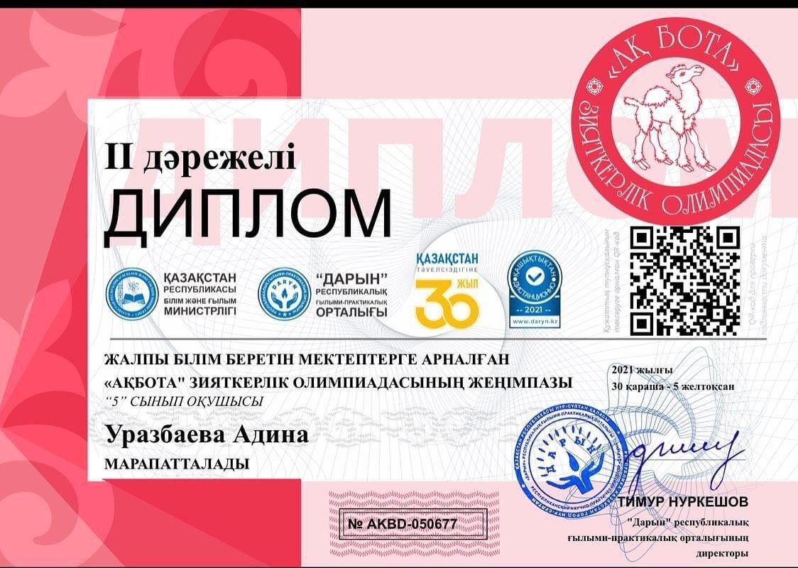 5А сынып оқушысы Уразбаева Адина, II-дәрежелі диплом