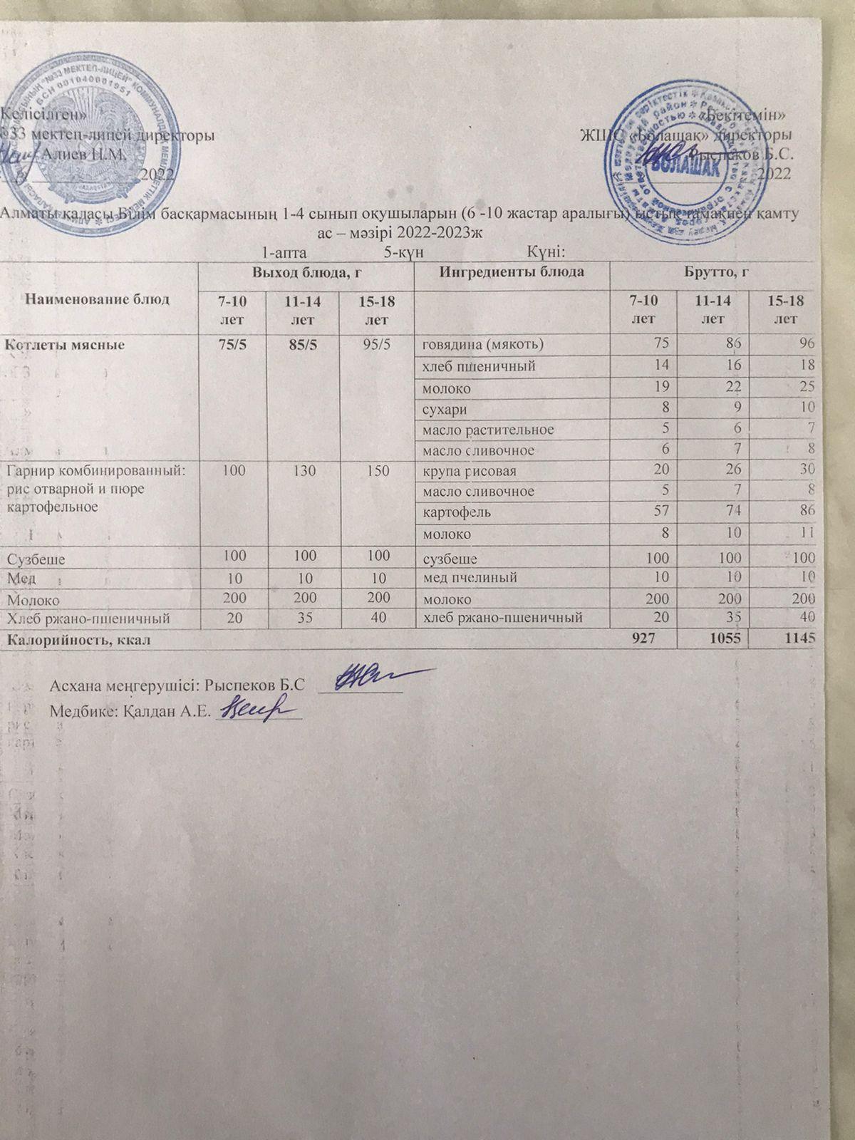 » Ас мәзірі 1 апта 5 күн