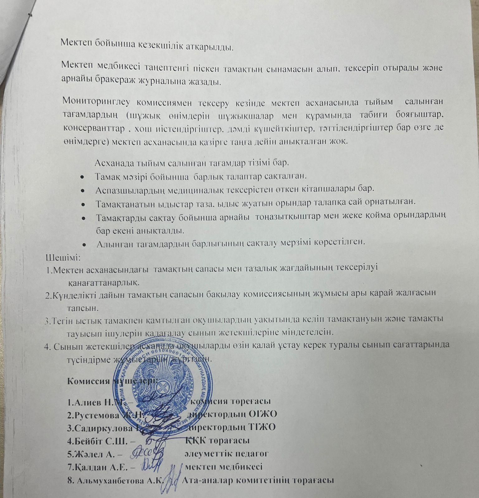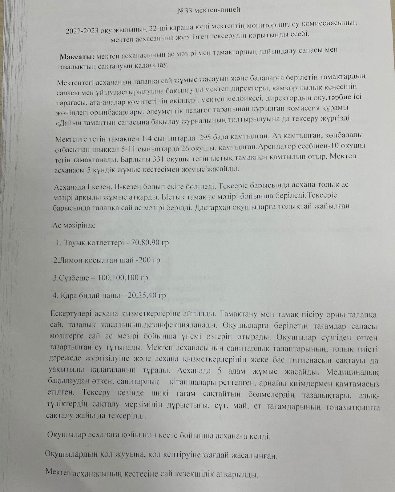 2022-2023 оқу жылының 22-шi қараша күні мектептің мониторинглеу комиссиясының мектеп асхасанына жүргiзген тексерудiң қорытынды есебі. Максаты: мектеп асханасының ас мәзiрi мен тамақтардың дайындалу сапасы мен тазалықтың сақталуын қадағалау.