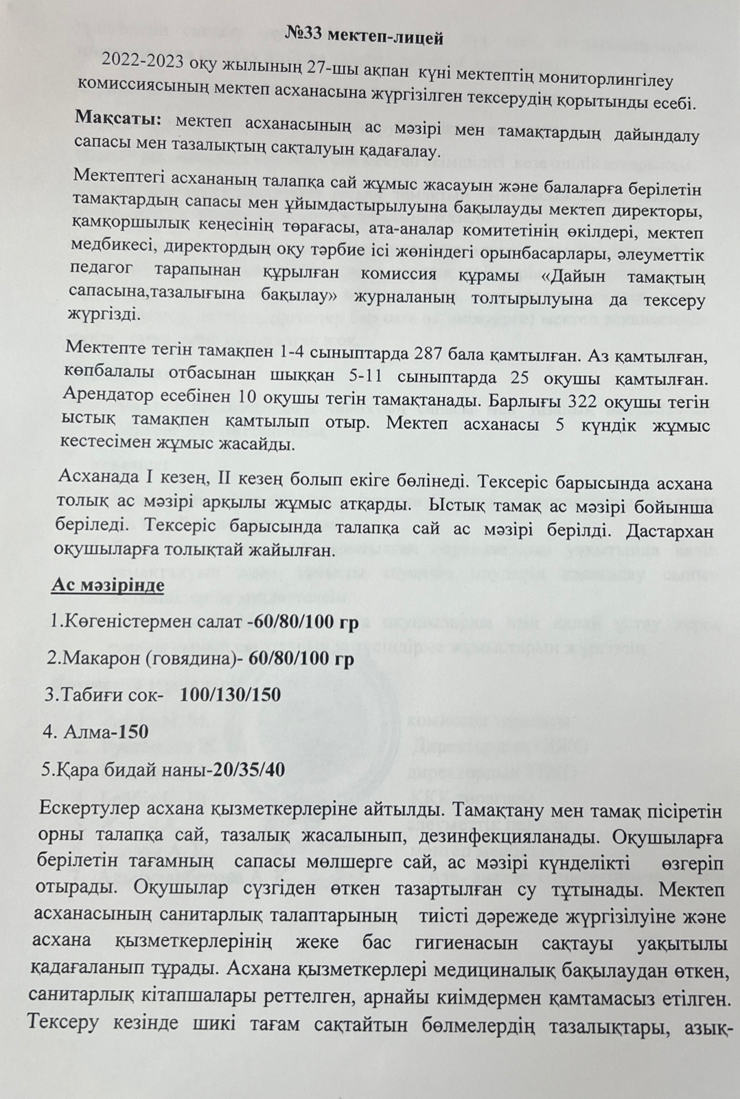 2022-2023 оқу жылының 27-шы ақпан күні мектептің мониторлингілеу комиссиясының мектеп асханасына жүргізілген тексерудің қорытынды есебі.