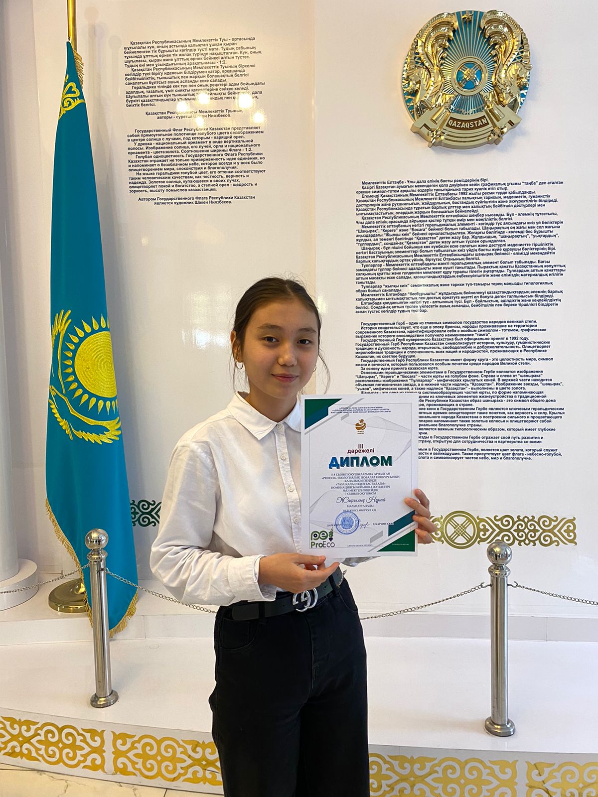 “PROECO” экологиялық жобалар конкурсының қалалық кезеңінде “ ТАЗА ҚАЛА СІЗДЕН БАСТАЛАДЫ” номинациясымен мектеп-лицейіміздің 7 -сынып оқушысы Жақсылық Нұрай марапатталды. Шәкіртімізді жеңісімен құттықтаймыз! Жетекшісі: Өмірқұл Қ.Н