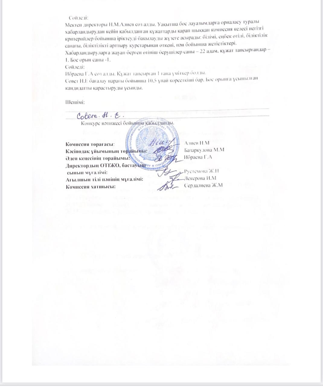 Мемлекеттік орта, техникалық және кәсіптік, орта білімнен кейінгі білім беру ұйымдарының басшыларын конкурстық орналастыру және мемлекеттік мектепке дейінгі, орта, техникалық және кәсіптік, орта білімнен кейінгі және қосымша білім беру ұйымының басшысы лауазымына конкурстық тағайындау қағидаларын бекіту туралы" Қазақстан Республикасы Білім және ғылым министрінің 2012 жылғы 21 ақпандағы № 57 бұйрығына өзгерістер енгізу туралыҚазақстан Республикасы Білім және ғылым министрінің 2021 жылғы 19 қарашадағы № 568 және Қазақстан Республикасы Еңбек және халықты әлеуметтік қорғау министрінің 2021 жылғы 22 қарашадағы № 432 бірлескен бұйрығы. Қазақстан Республикасының Әділет министрлігінде 2021 жылғы 24 қарашада № 25349 болып тіркеген бұйрығына сәйкес Мемлекеттік білім беру ұйымдарының педагогтерін лауазымға тағайындауға конкурс өткізу тәртібі ережесіне сәйкес КММ Алматы қаласы Медеу ауданы №33 мектеп-лицей конкурс жариялайды.