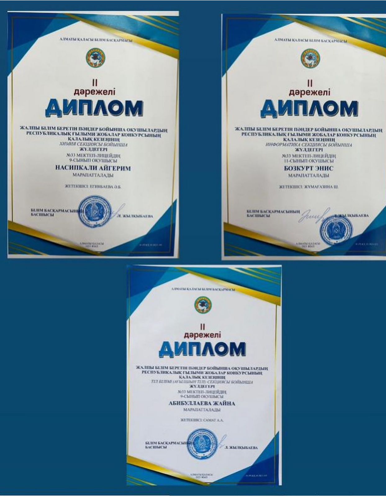 9-11 сыныптар арасында өткен қалалық ғылыми жобалар конкурсынан мектеп- лицейіміздің оқушылары жүлдерлі орын иегерлері атанды: