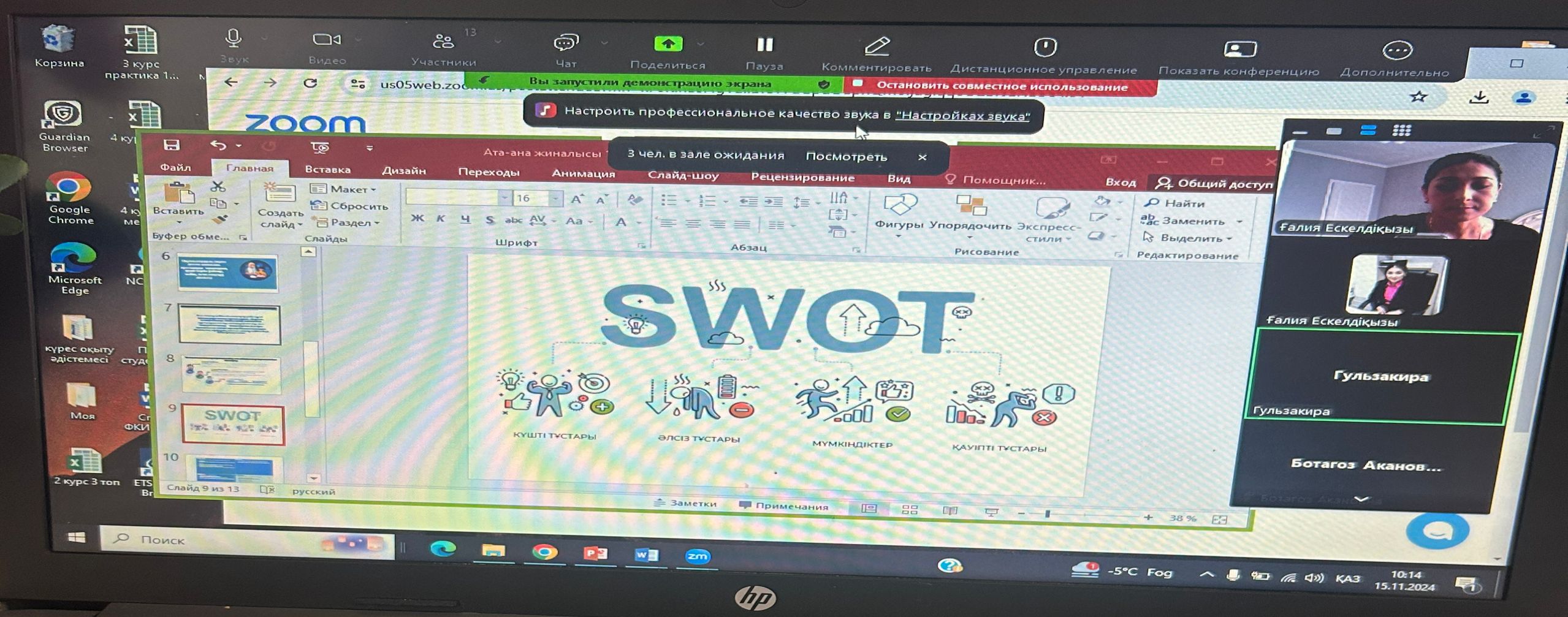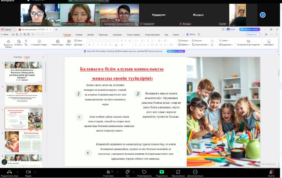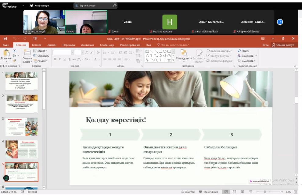 “Біртұтас тәрбие” бағдарламасы негізінде жоспарға сәйкес қарашаның 15-і күні мектебімізде 5-11 сынып аралығында ата-аналар жиналысы өтті. “Баланың оқуға ынтасын қалай арттыруға болады?” өзекті тақырып аясында өзара пікір алмасты. Сынып ортасына SWOT талдау жасалып, жиналыста талқыланды. “Үштік жоба” жұмысын жандандыру қолға алынды.
