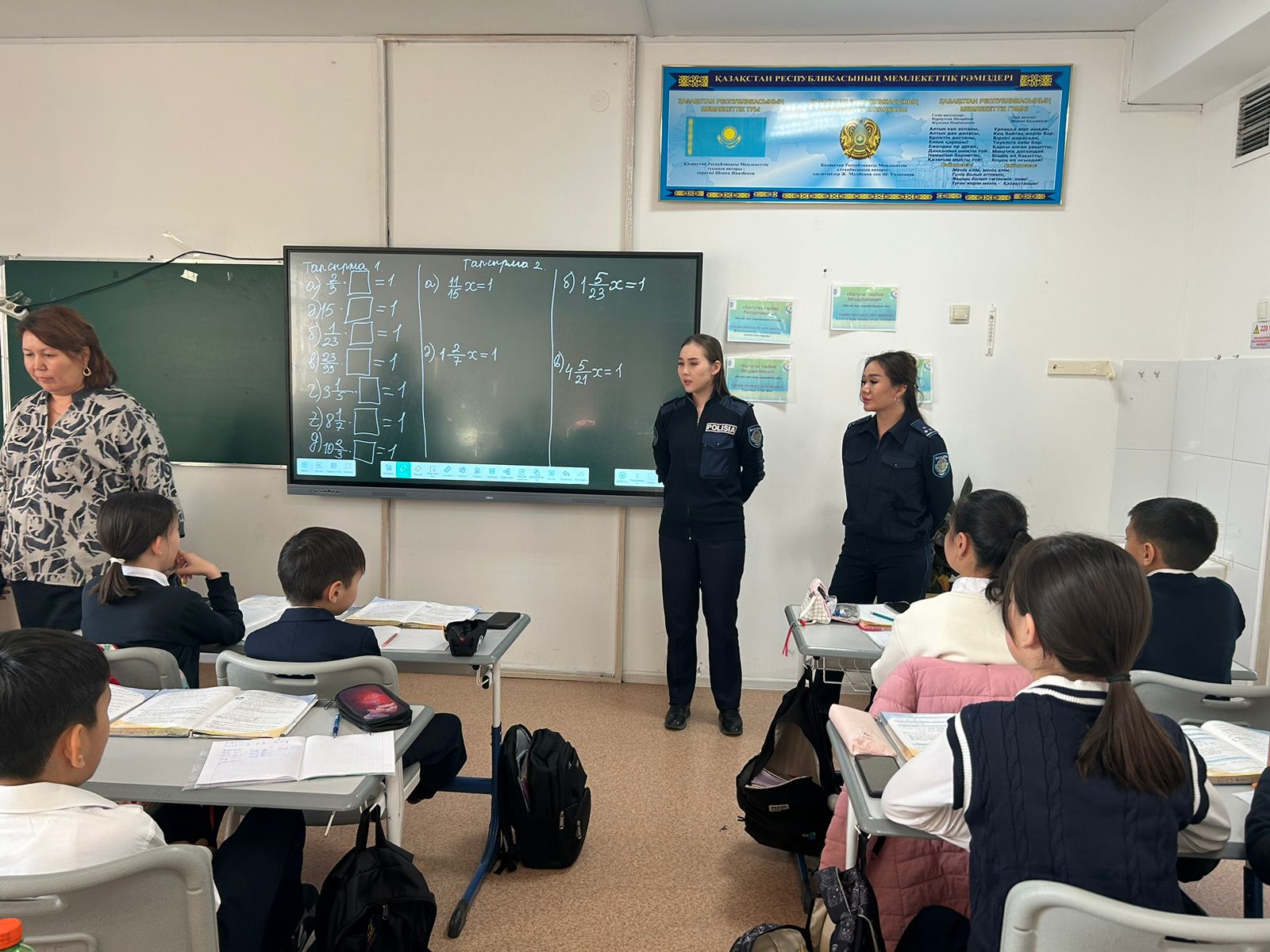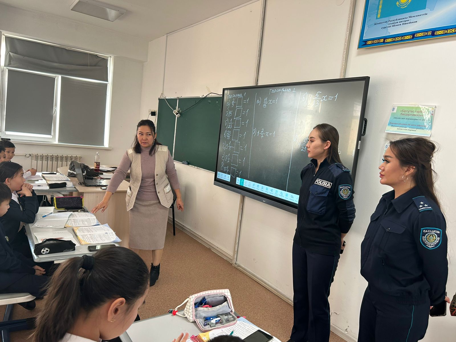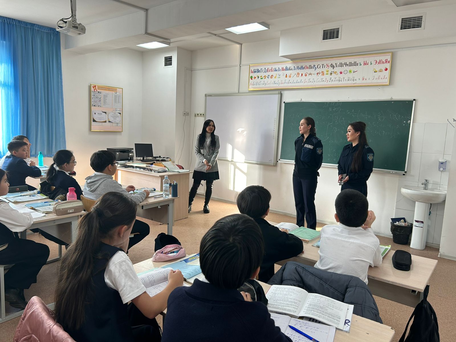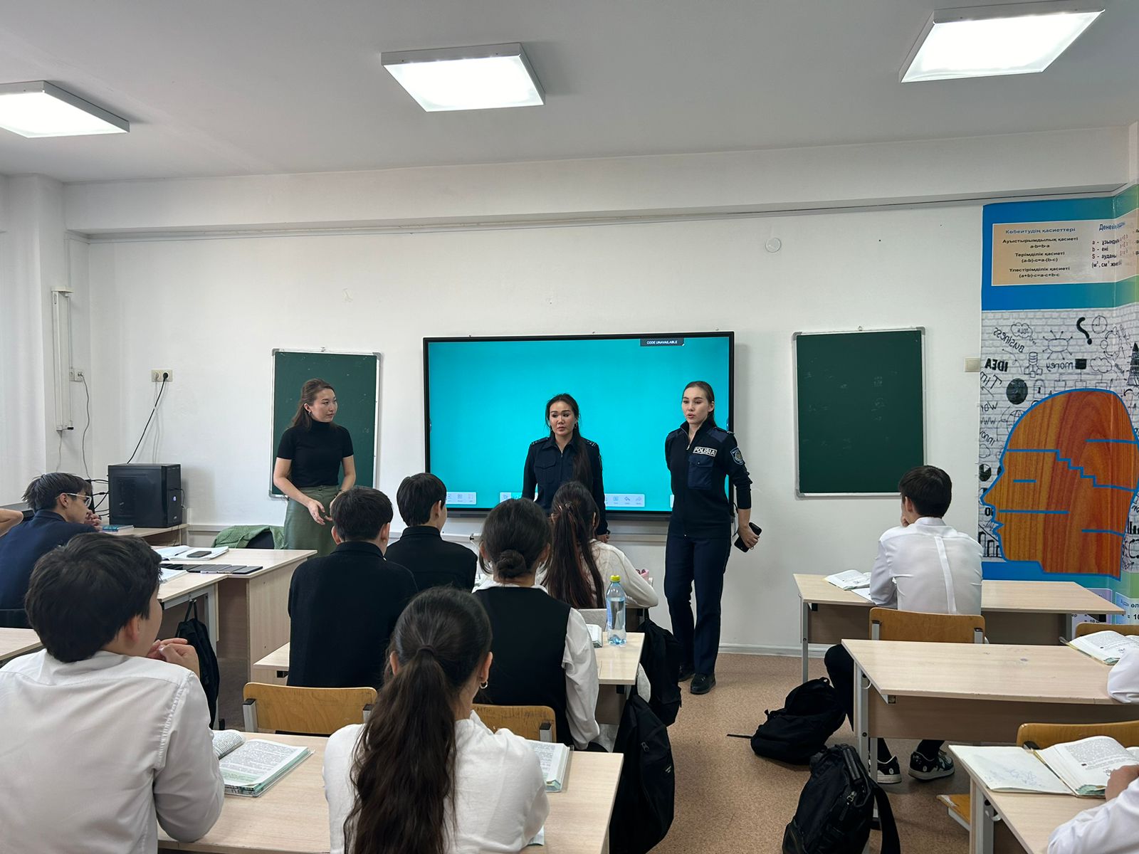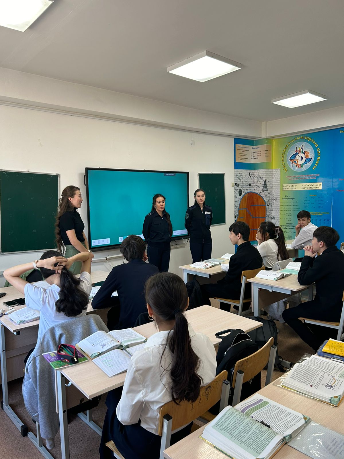28.11.2024ж мектеп инспекторы Шайхисламқызы Ақтілек пен Аға лейтенант Абусеитова А.С оқушыларының арасында құқық бұзушылықтың алдын алу, темекі өнімдерін қолдануға болмайтындығын, денсаулыққа тигізер залалымен, оқушылардың кешкі беймезгіл уақытта қоғ