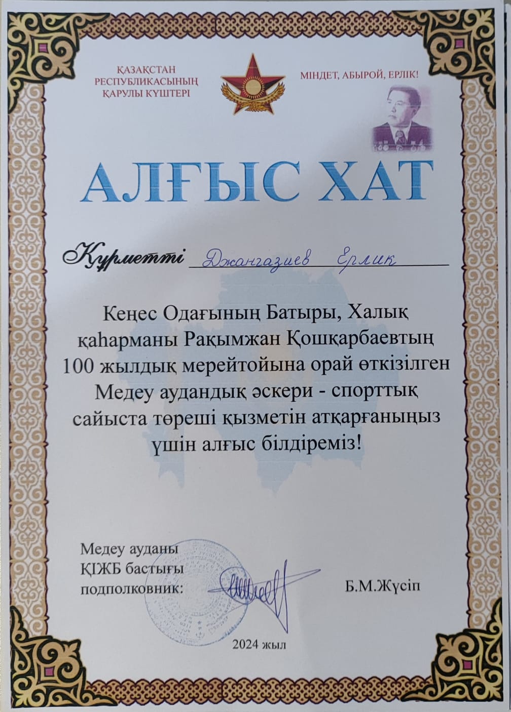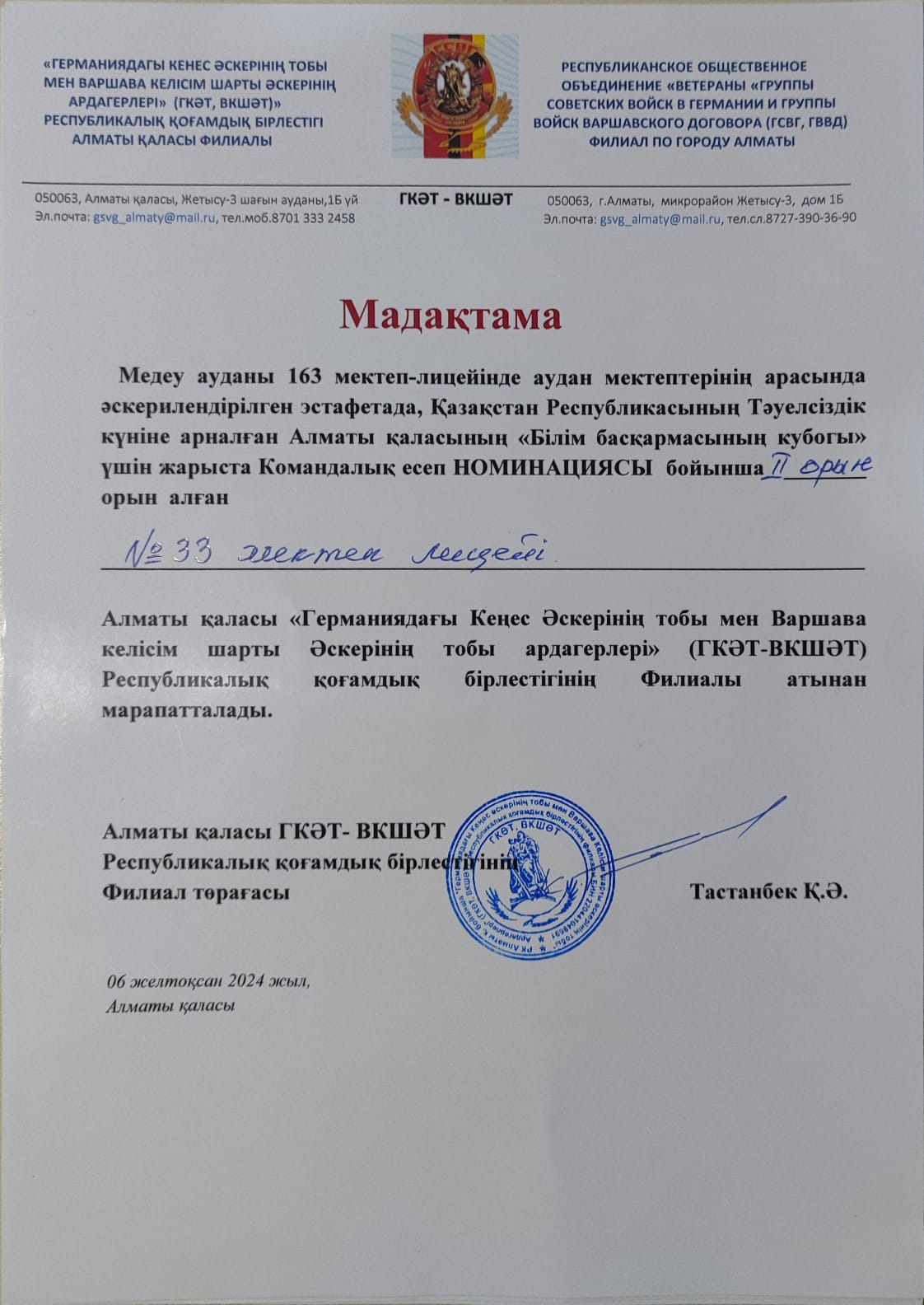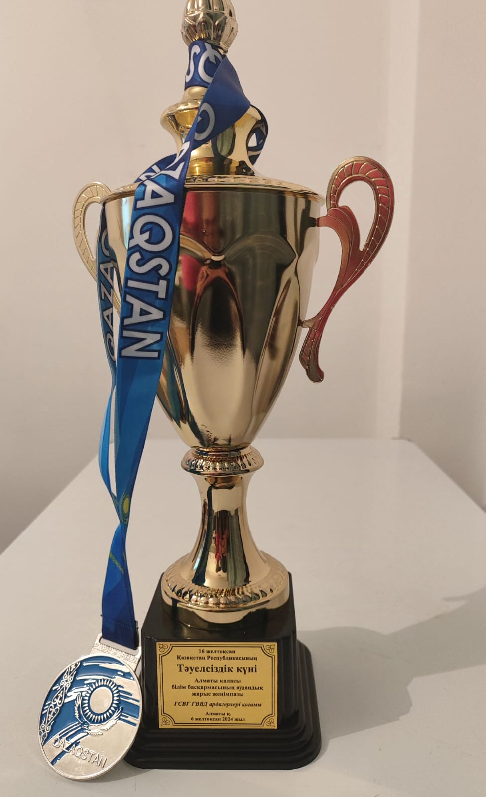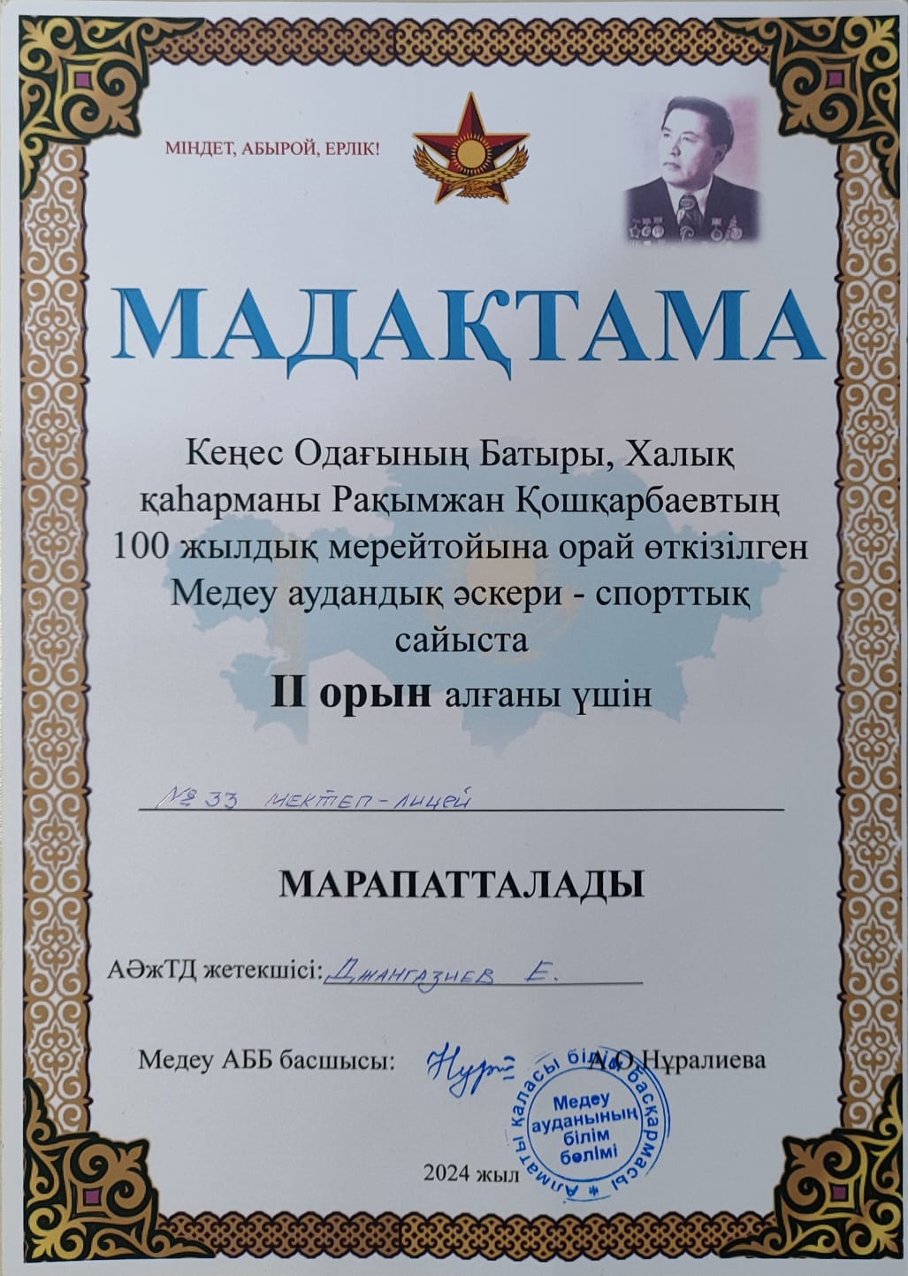 Медеу ауданы мектептері арасында әскерилендірілген эстафетада, Қазақстан Республикасының Тәуелсіздік күніне арналған Алматы қаласының “Білім басқармасының кубогы” жарысында мектебіміздің 10-сынып оқушылары құрама командасы ІІ орын иеленді. Жетекшісі АӘ және ТД мұғалімі Е.Б. Джангазиевті құттықтаймыз!
