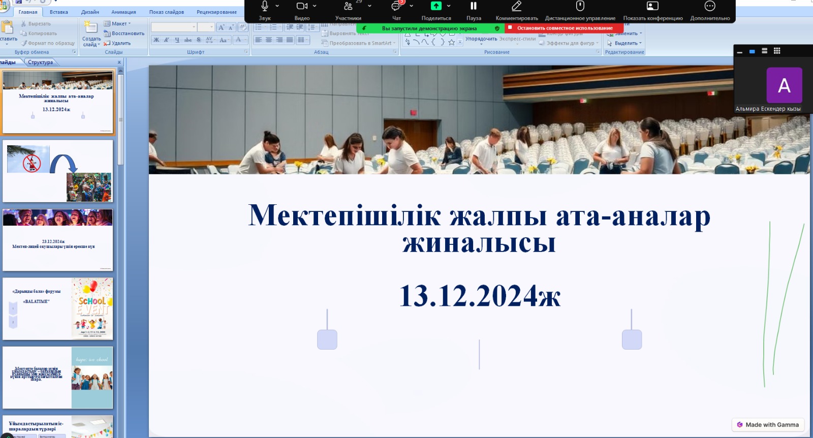 Бүгін мектебімізде 13.12 күні Медеу ауданының төтенше жағдай басқармасының инженері, қорғаныс штабының маманы лейтенант Гиззатов Алишер Адилулының қатысуымен жалпы мектепішілік ата-аналар жиналысы өтілді.