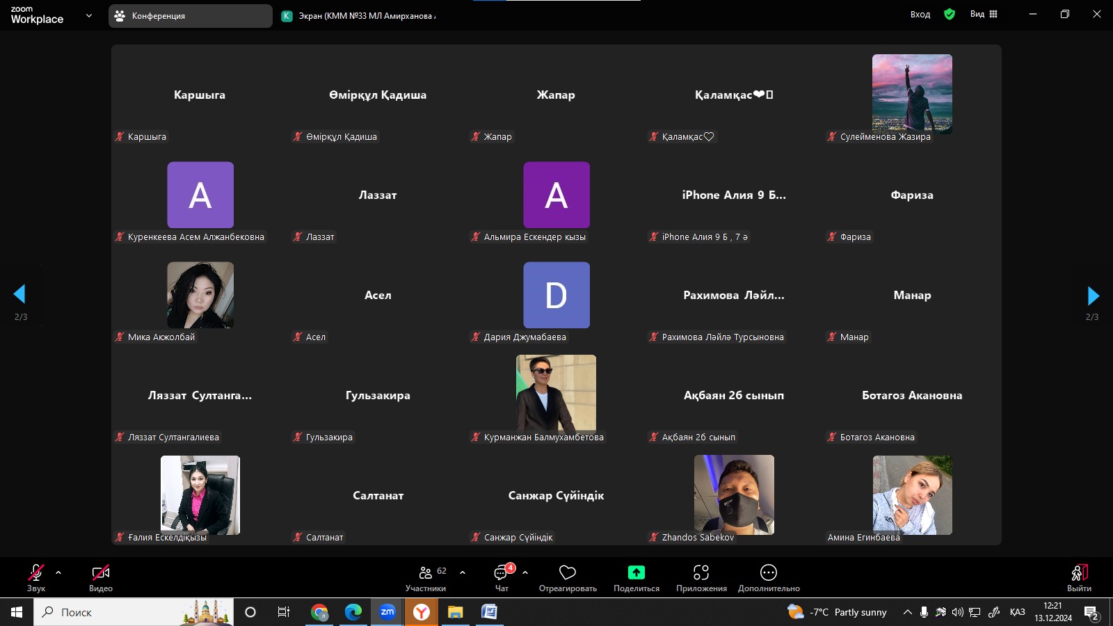 Бүгін мектебімізде 13.12 күні Медеу ауданының төтенше жағдай басқармасының инженері, қорғаныс штабының маманы лейтенант Гиззатов Алишер Адилулының қатысуымен жалпы мектепішілік ата-аналар жиналысы өтілді. Жиналыстың мақсаты қауіпсіздік нұсқаулықты басшылыққа ала отырып, оқушылардың денсаулығына қауіпті жағдайлар мен олардың алдын алу мақсатында түсіндіру жұмыстары жүргізілді.