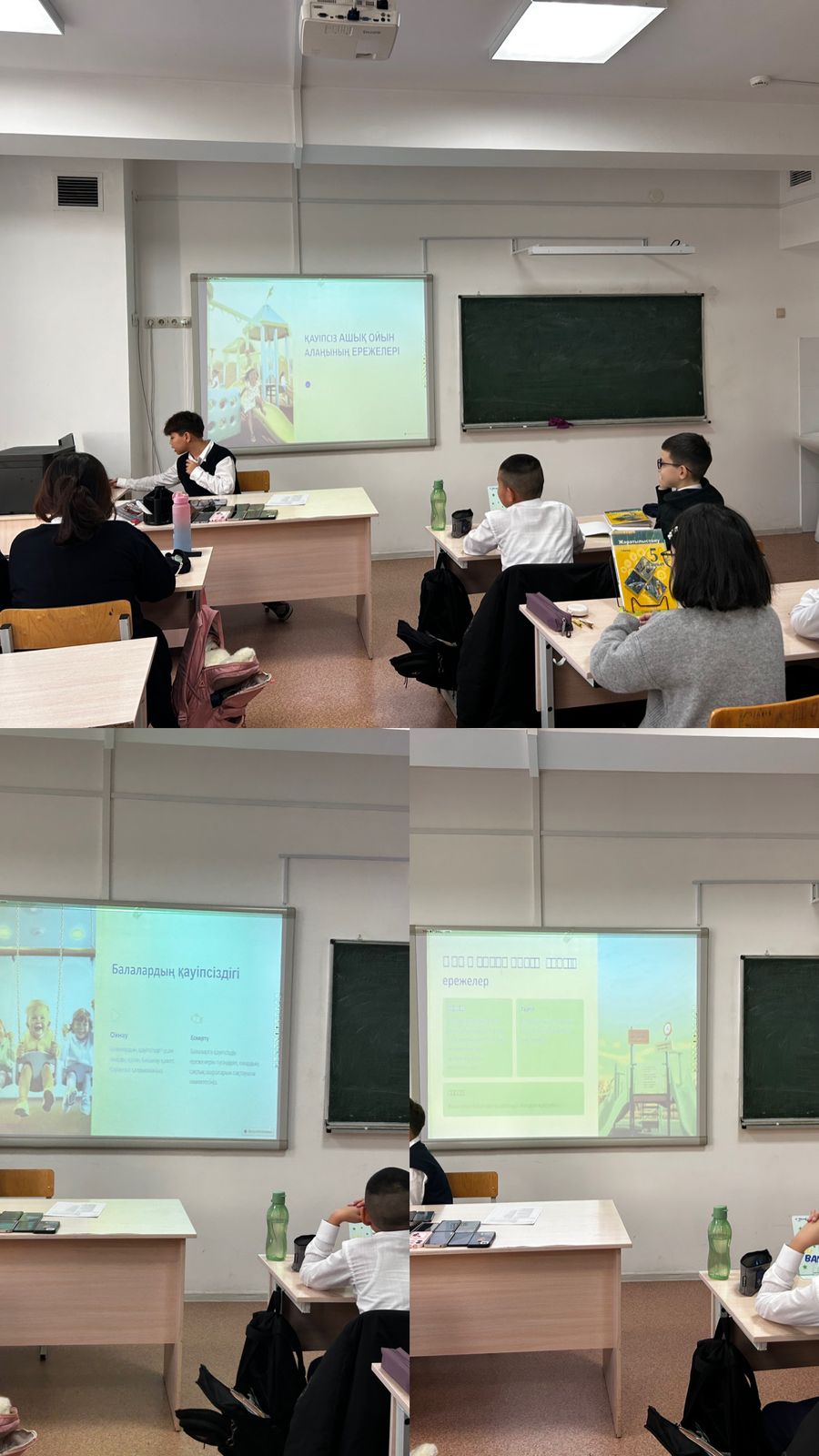 13.01 5-сыныптарда сынып сағаты шеңберінде «Қауіпсіз ашық ойын алаңының ережелері» тақырыбында қауіпсіздік сабағы өтілді. Ойын алаңында өзін қалай ұстау керектігі жайында қарапайым ережелермен таныстырылды.