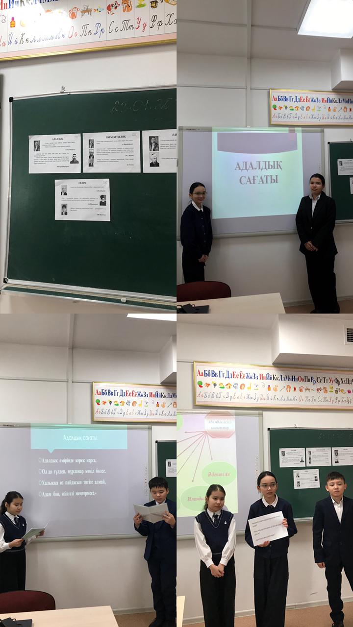 "Адалдық сағаты" тақырыбында сынып сағаттары өткізілді. Мақсаты: Оқушыларды адалдыққа, еңбекқорлыққа тәрбиелеу. Адал ұрпақ тәрбиелеу – қай уақытта болса да өз маңыздылығын жоғалтпаған мәселе.