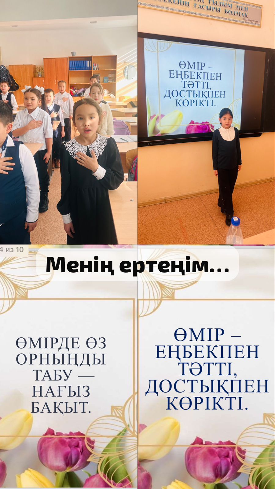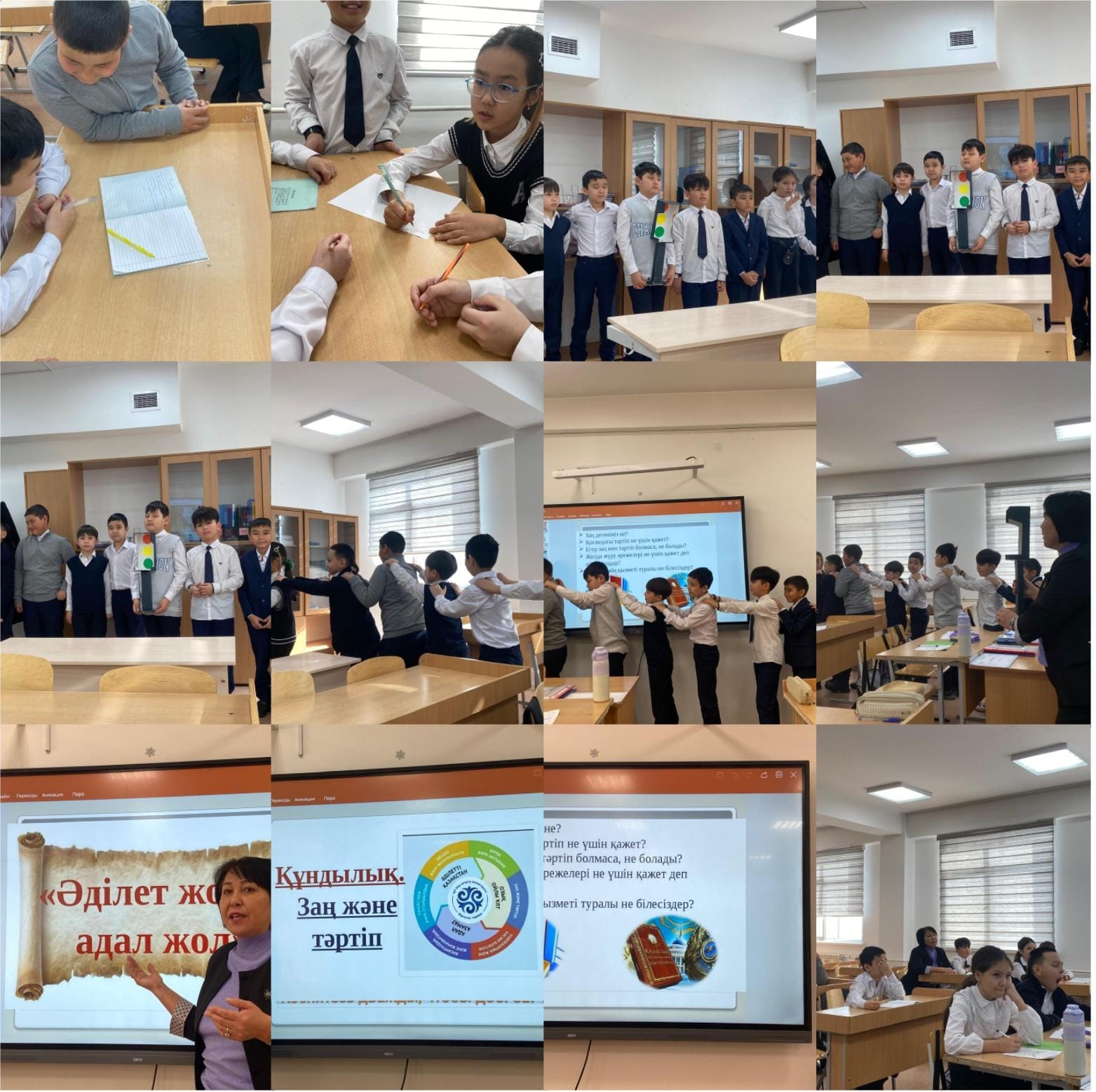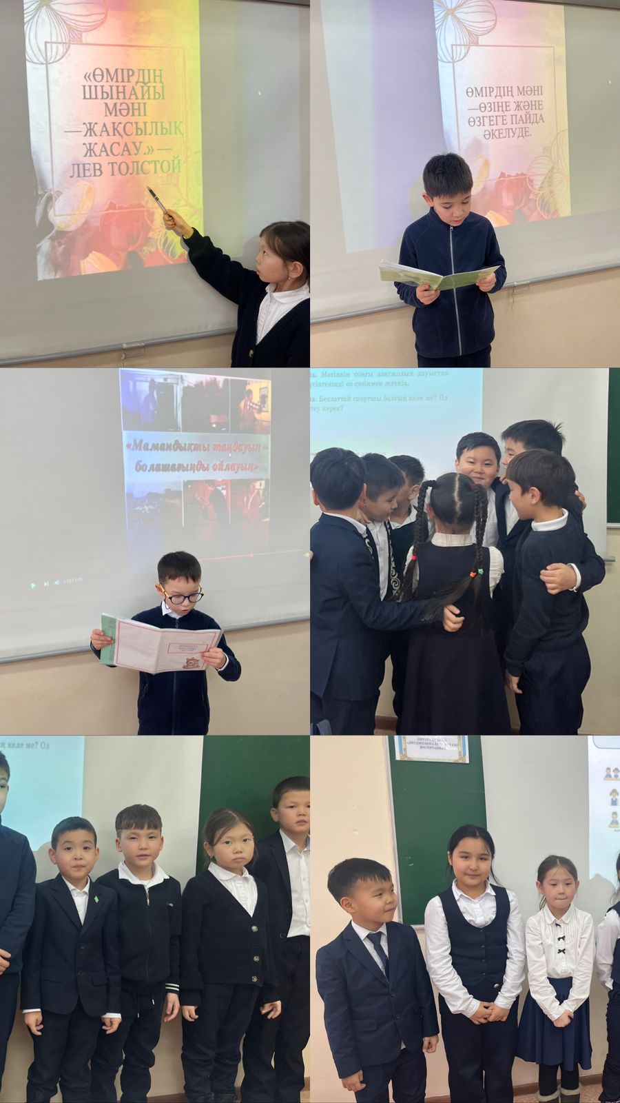 27.01.2025 ж күні 1-4 сыныптарға "Менің ертеңім" тақырыбында сынып сағаты өтілді. Балаларды болашаққа деген оң көзқарас қалыптастыруға үйрете отырып, мақсат қою және оған жетудің қадамдарын түсіндіру және армандарды жүзеге асыру жолдары туралы ой қозғау мақсаты жолға қойылды. 5-8 сыныптарға "Заң және тәртіп" тақырыбында өтілген сынып сағатының басты мақсаты оқушыларды заң мен тәртіптің маңыздылығын түсінуге және оған құрметпен қарауға үйрете отырып, қоғамда тәртіп сақтау мен заңға бағынудың жеке және қоғамдық өмірге тигізер пайдасын көрсету. 9-11 сыныптарға өтілген «Арам мен адал, обал мен сауап – ұлтымыздың ұстанымы» тақырыбындағы сынып сағатында адалдық пен шындықтың адами қарым-қатынастағы мәнін түсіндіру мақсаты көзделді.