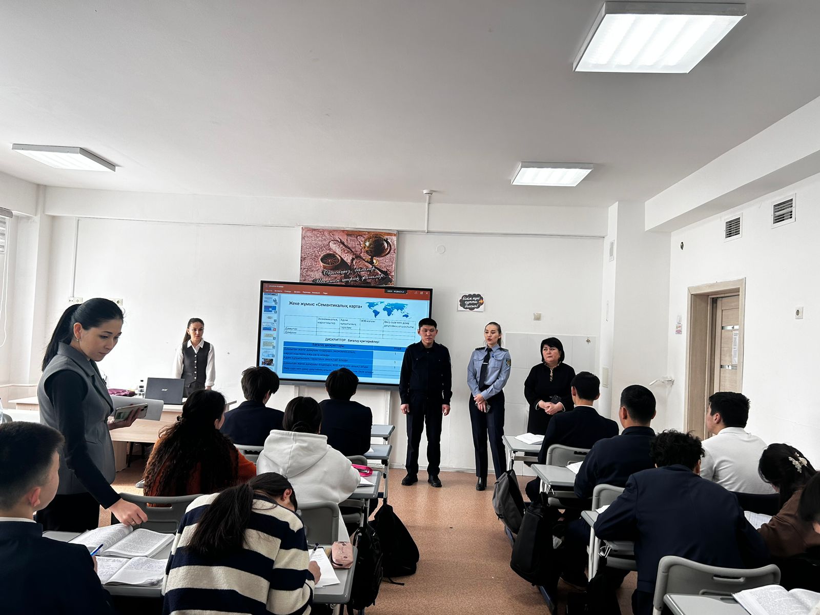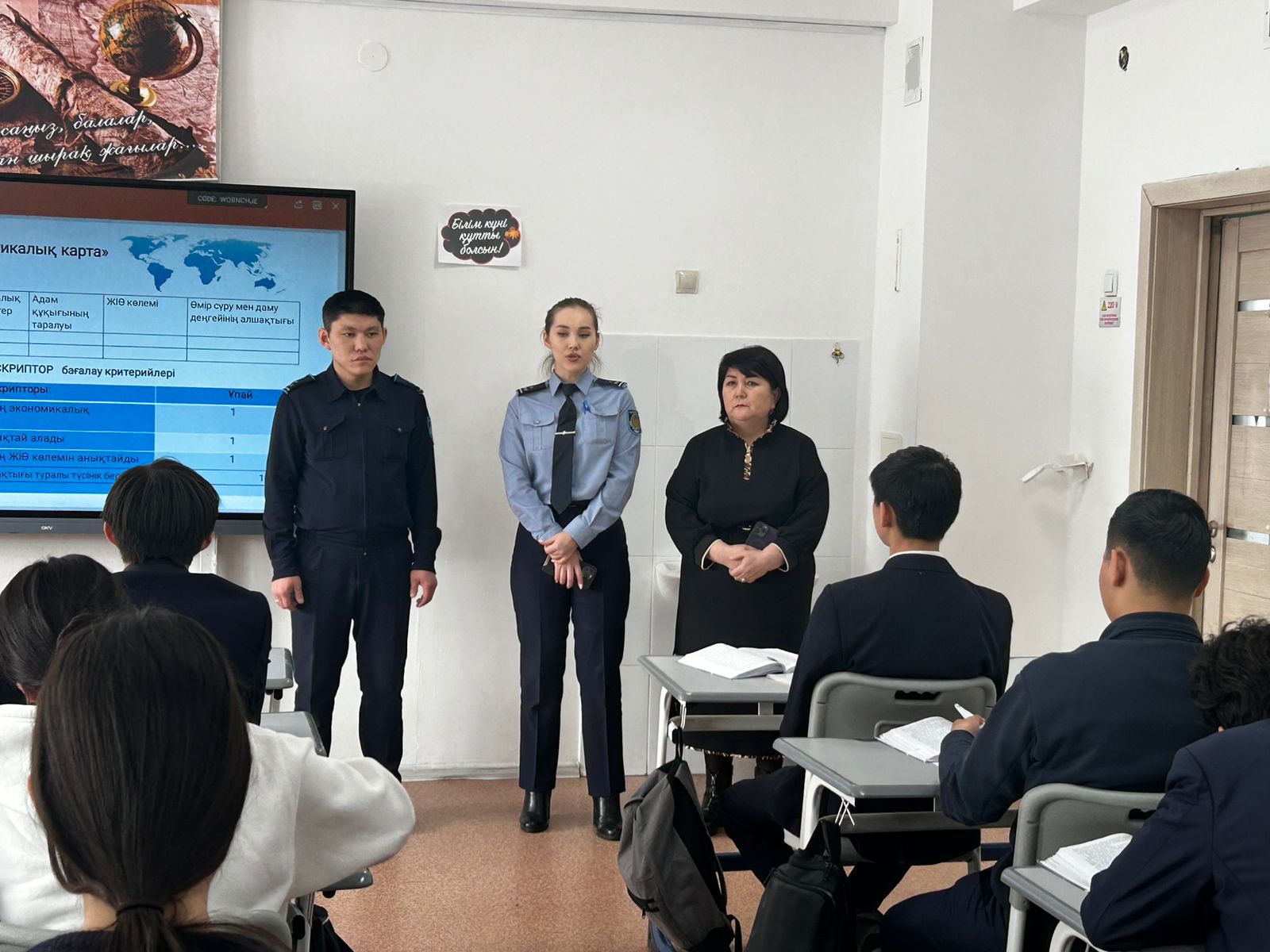 12.02.2025ж мектебіміздің 10-11 сынып оқушыларына мектеп инспекторы Шайхисламқызы А пен ага лейтенант Отар Д.С. профидактикалық әңгіме жүргізді. Мектептің ішкі тәртібі, жасөспірім және қылмыс, әлеуметтік желілердің зияны,жолдағы қауіпсіздік, әлімжеттік күш көрсету, бопсалау, зиянды әдеттерден аулақ болу, темекі өнімдерін қолдануға тиым салу, ұрлық, құқықбұзушылық, оның алдын алу бағытында түсіндірме жұмыстарын жүргізді.