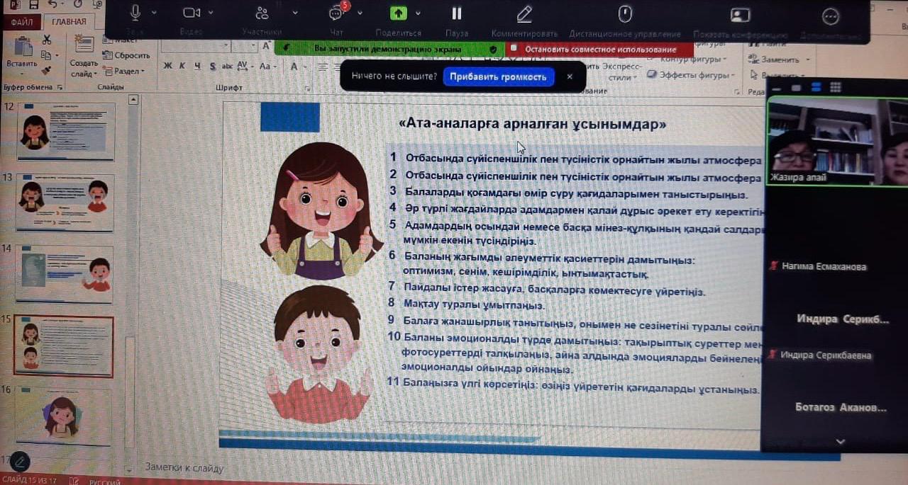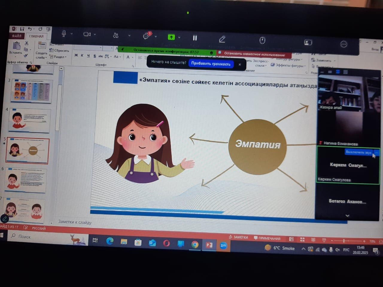 20.02.2025ж. күні “Ата-аналарды педагогикалық қолдау” бағдарламасын жүзеге асыру мақсатында 1-4 сыныптардың ата-аналарына “Балаға өзінің және басқалардың сезімдерін түсінуді қалай үйретуге болады?” тақырыбында жиналыс өткізілді. Жиналыс барысында эмоционалды көңіл-күй, эмпатия, эмпатияның түрлері, эмпатияның даму деңгейлері туралы айтылып, миға шабуыл жасалды, “эмпатия картасы” жасалды. Ата-аналарға ұсынымдар берілді.