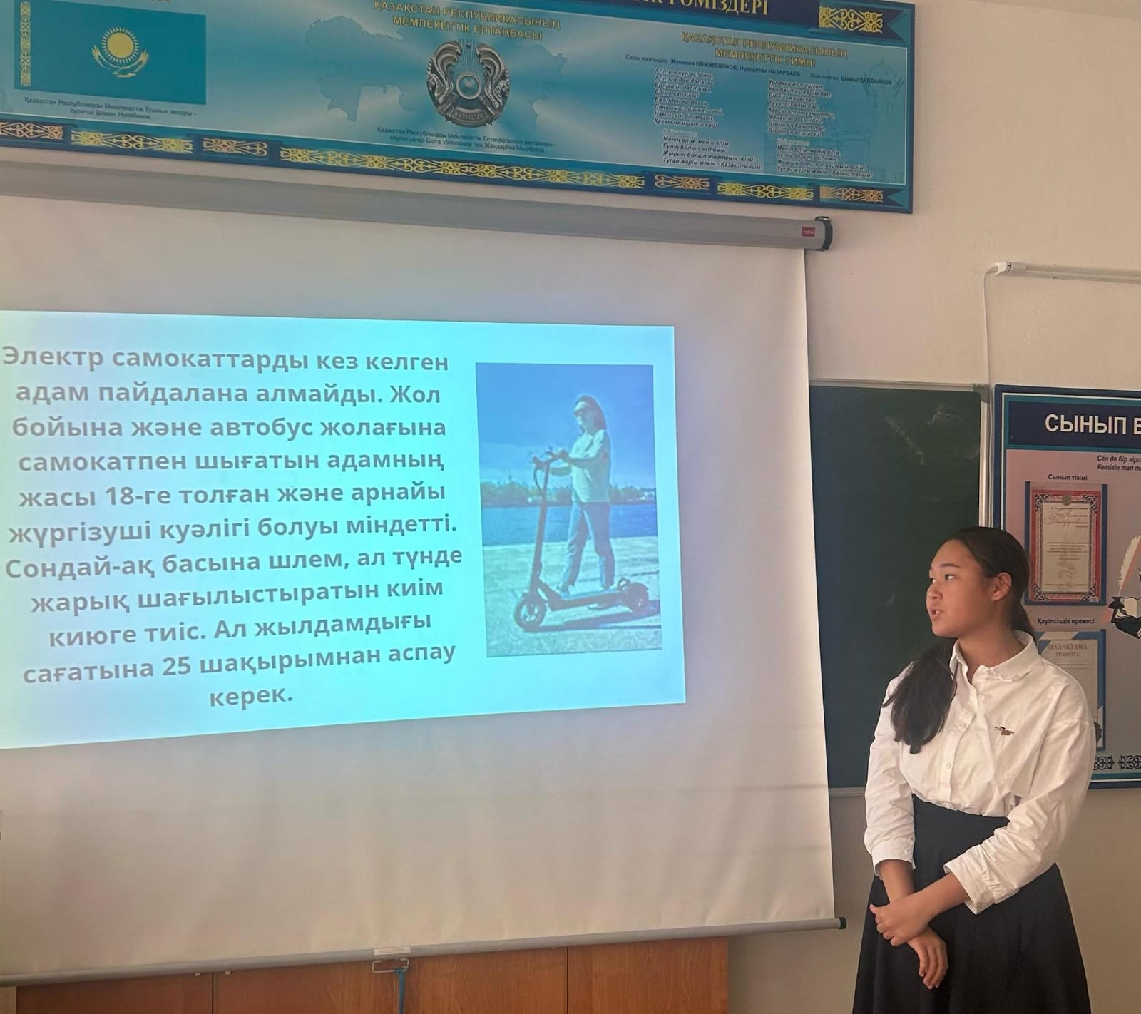 Бүгін мектебімізде 01.04.2025ж күні мектеп оқушыларына жолда жүру ережесі бойынша, жол қозғалысы ережелеріне электрсамокаттар мен мопедтерді басқару бойынша қауіпсіздік сабағы өтілді.