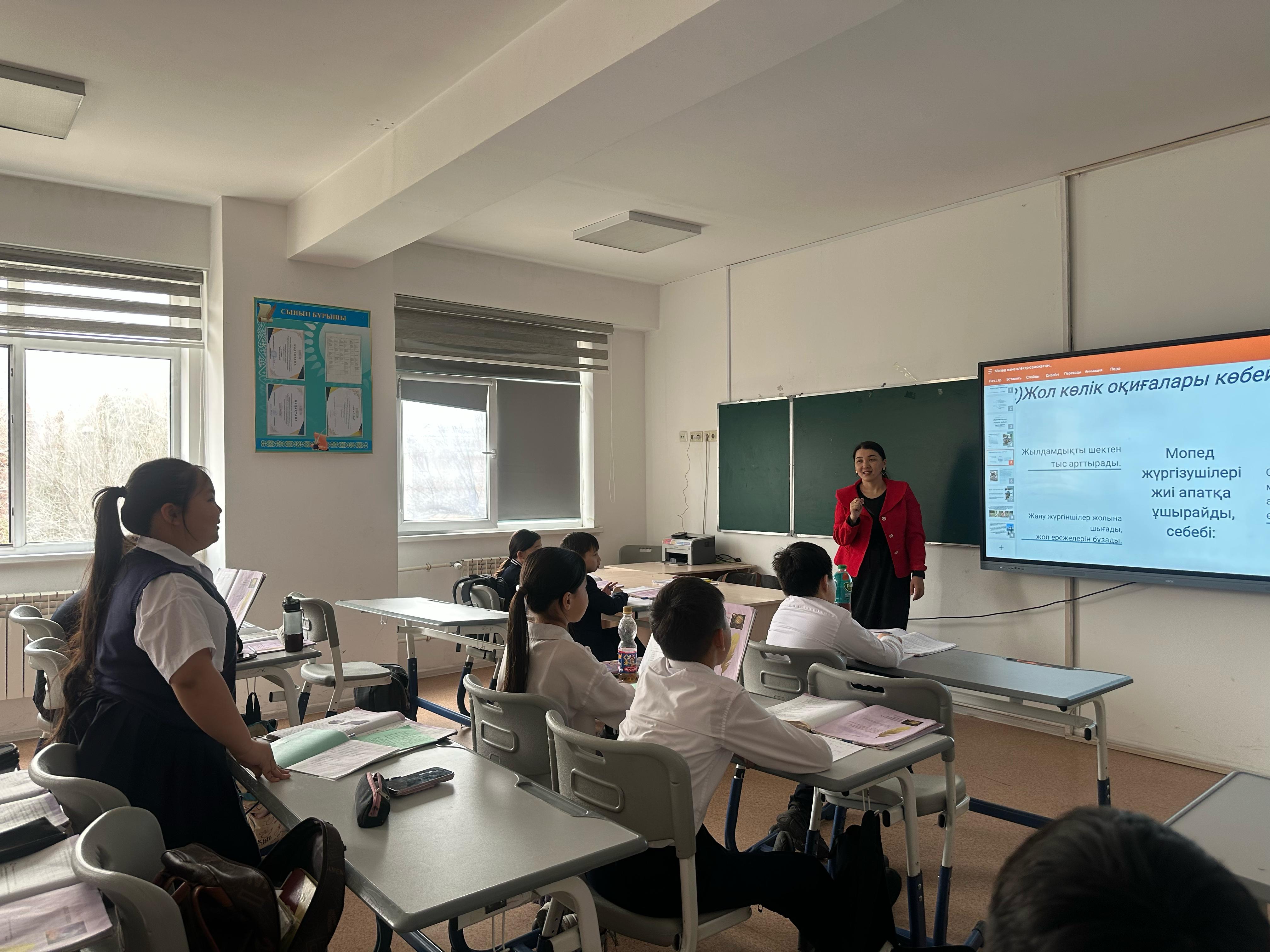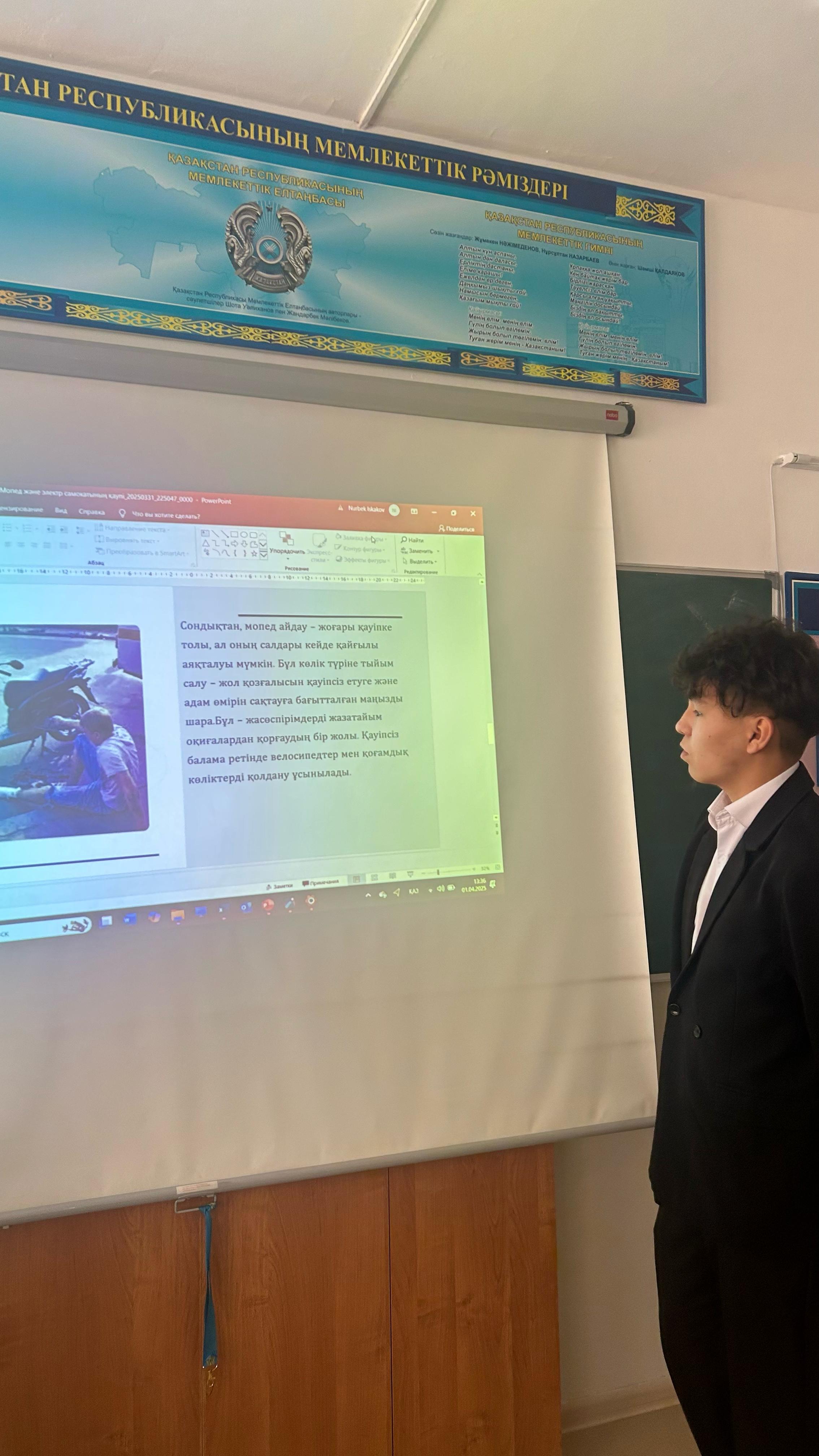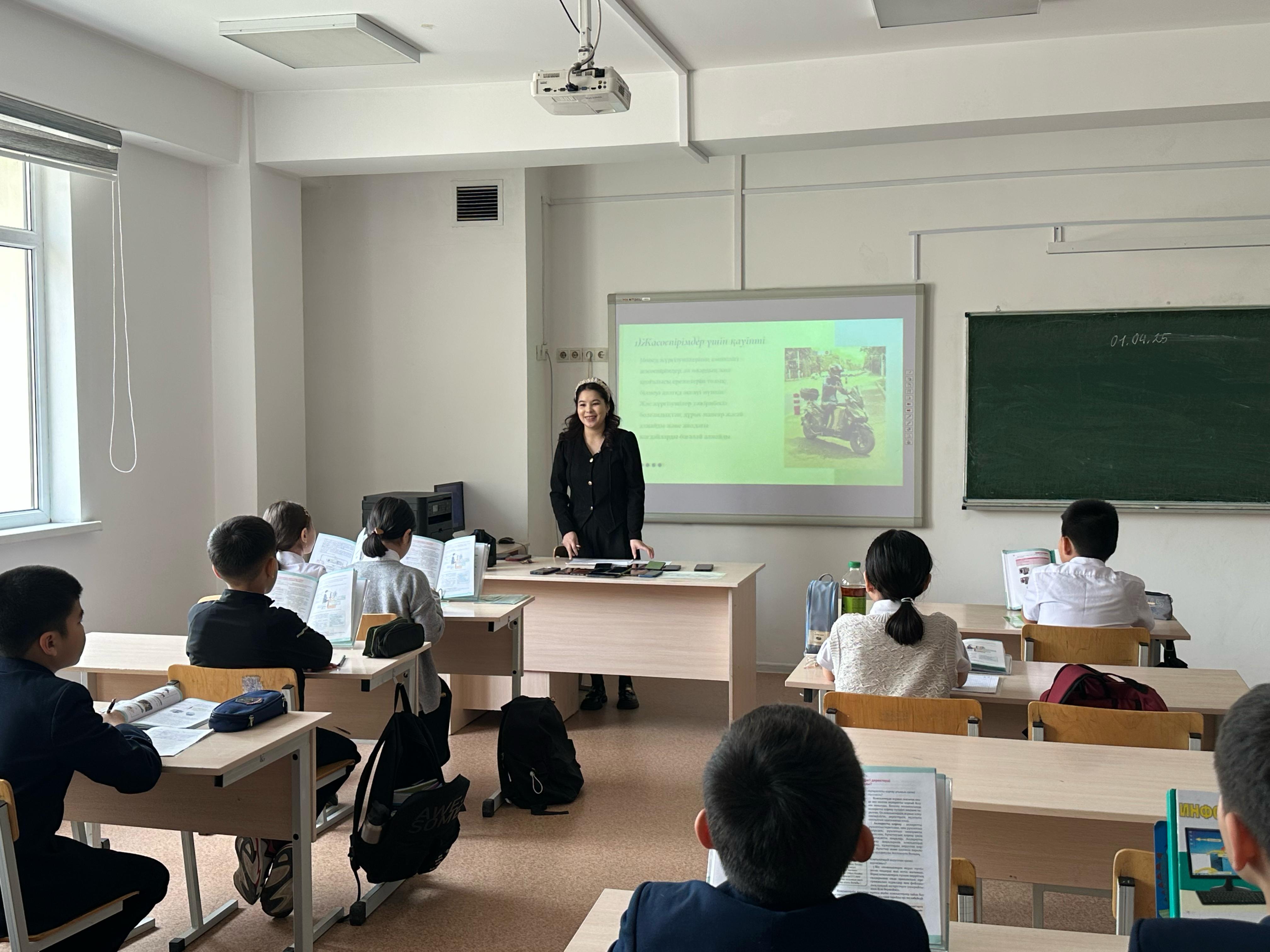 Жол ережесін сақтау - қауіпсіздік кепілі, ережені сақтау - баршаның міндеті. Бүгін мектебімізде 01.04.2025ж күні мектеп оқушыларына жолда жүру ережесі бойынша, жол қозғалысы ережелеріне электрсамокаттар мен мопедтерді басқару бойынша қауіпсіздік сабағы өтілді.