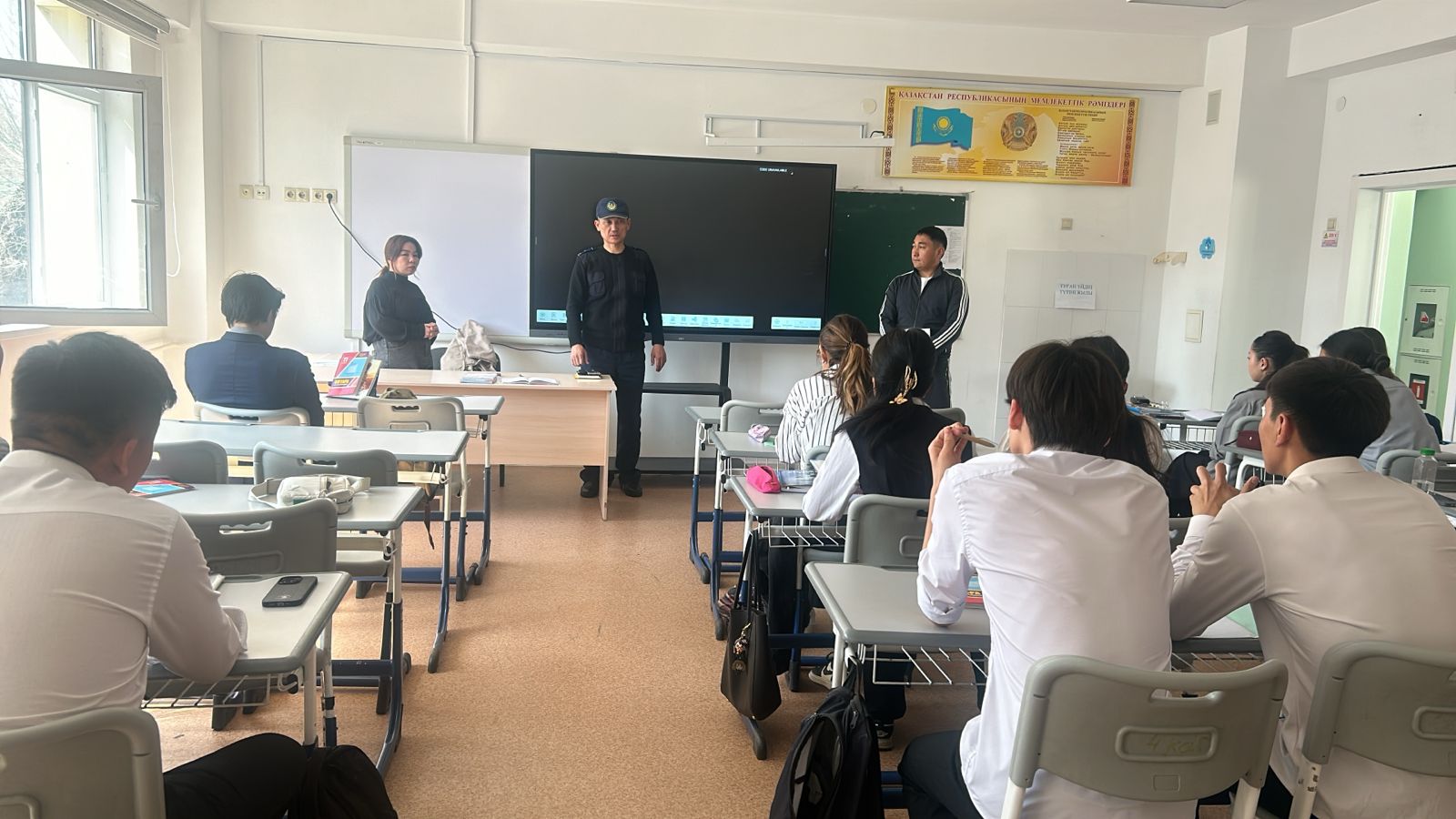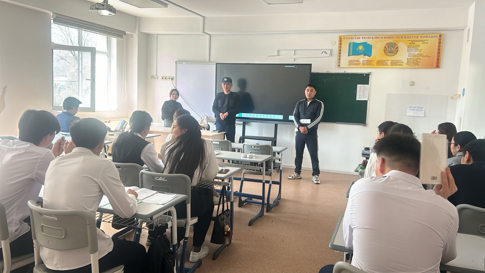04.04.2025 ж күні ювеналдық полиция инспекторларымен оқушылар арасында жол қауіпсіздік ережелерін түсіндіру бойынша сабақтар өткізілді. Атап айтқанда полиция майоры Махимов Нұрбақыт және лейтенант Отар Д оқушыларға көшені кесіп өту үшін арнайы белгіленген жерлермен жүруді, оқушыларды маңызды жол белгілерімен таныстырды. Жолда абай болудың, жолда жүру ережесін қатаң сақтаудың, жаяу жүргінші жолағының, тротуардың қаншалықты маңызды екендігін айтып ұғындырды. 2025 жылғы 5 сәуірден бастап мопедтер ресми түрде механикалық көліктерге теңестірілгені жөнінде ақпарат беріп өтті. Мұндай іс-шаралардың мақсаты балалардың қатысуымен болатын жол-көлік оқиғаларының алдын алу, жасөспірімдердің жолда жүру қауіпсіздігіне байланысты жолда жүру ережелерін түсіндіру. Көп жағдайда жасөспірімдердің қатысуымен болған жол-көлік оқиғасында балалардың жолда алаңғасарлыққа салынып, ұялы телефон пайдаланып немесе музыканы бар дауысына шығарып, құлаққапты құлағына салып алып көліктердің дыбысына мән бермегендігінен орын алып жатады. Мопед, электросамокат және велосипед жүргізушілерінің қатысуымен болатын жол-көлік оқиғаларының алдын алу мақсатында мектеп оқушыларына түсіндірме жұмыстары кеңінен жүргізілді.