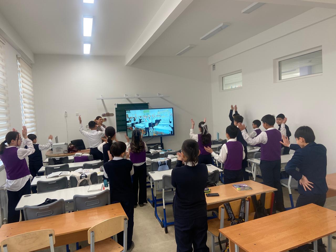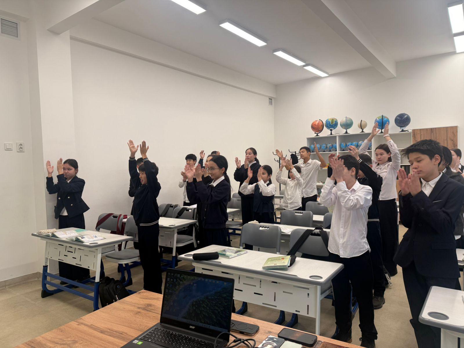 Оқушыларымыз күнді көтеріңкі көңіл күймен қарсы алып, таңғы ритмикалық жаттығу орындады. Қарапайым қимылдар арқылы дене қыздырып, сергектік пен күш жинады. Ритмге сай қимылдап, бір-біріне жақсы энергия сыйлаған балалардың жүзінен қуаныш анық байқалды