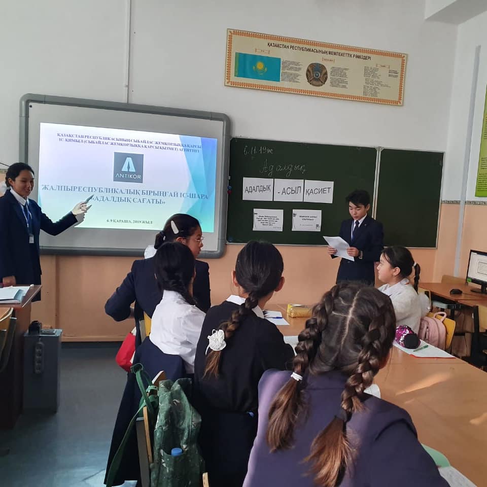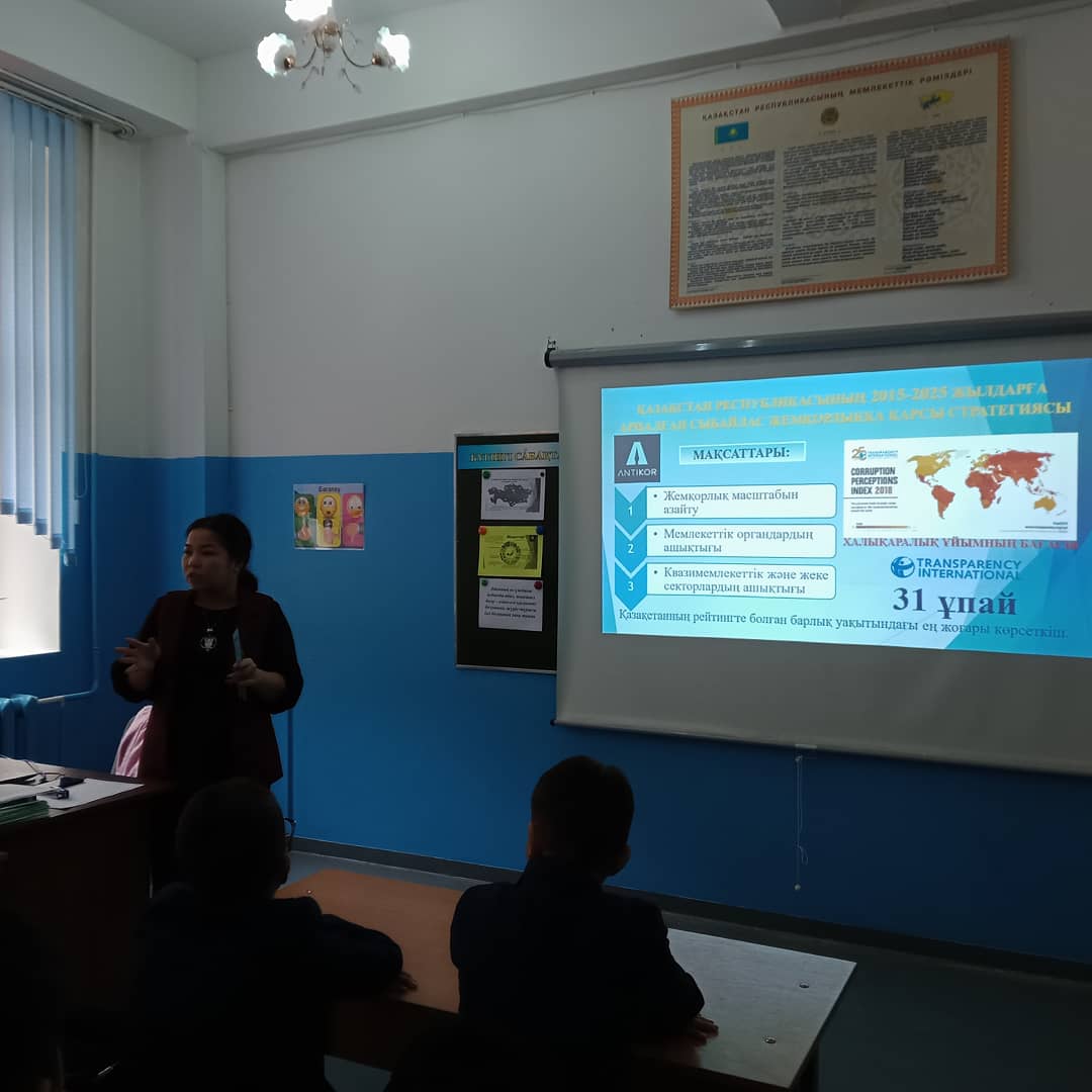 Қазақстан Республикасының Сыбайлас жемқорлыққа қарсы іс-қимыл агенттігінің төрағасы А.Ж. Шпекбаевтың төрағалығымен өткен аппараттық жиналысының №10хаттамасын орындау мақсатында Нұр-Сұлтан, Алматы, Шымкент қалаларында және өңірлердегі барлық орта білім беру мекемелерінде 2019 жылдың 6 қарашасында бірыңғай жалпыреспубликалық "Адалдық сағаттарын" өткізу жоспары бойынша мектебімізде сынып сағаттары өткізілді! Іс шараның мақсаты: өскелең жас ұрпақтың бойында адалдық, парасаттылық, әділдік, сенім құндылықтарын сіңіруге және жас буынның рухани болмысын бекітіп, сыбайлас жемқорлыққа қарсы мәдениетін қалыптастыру.