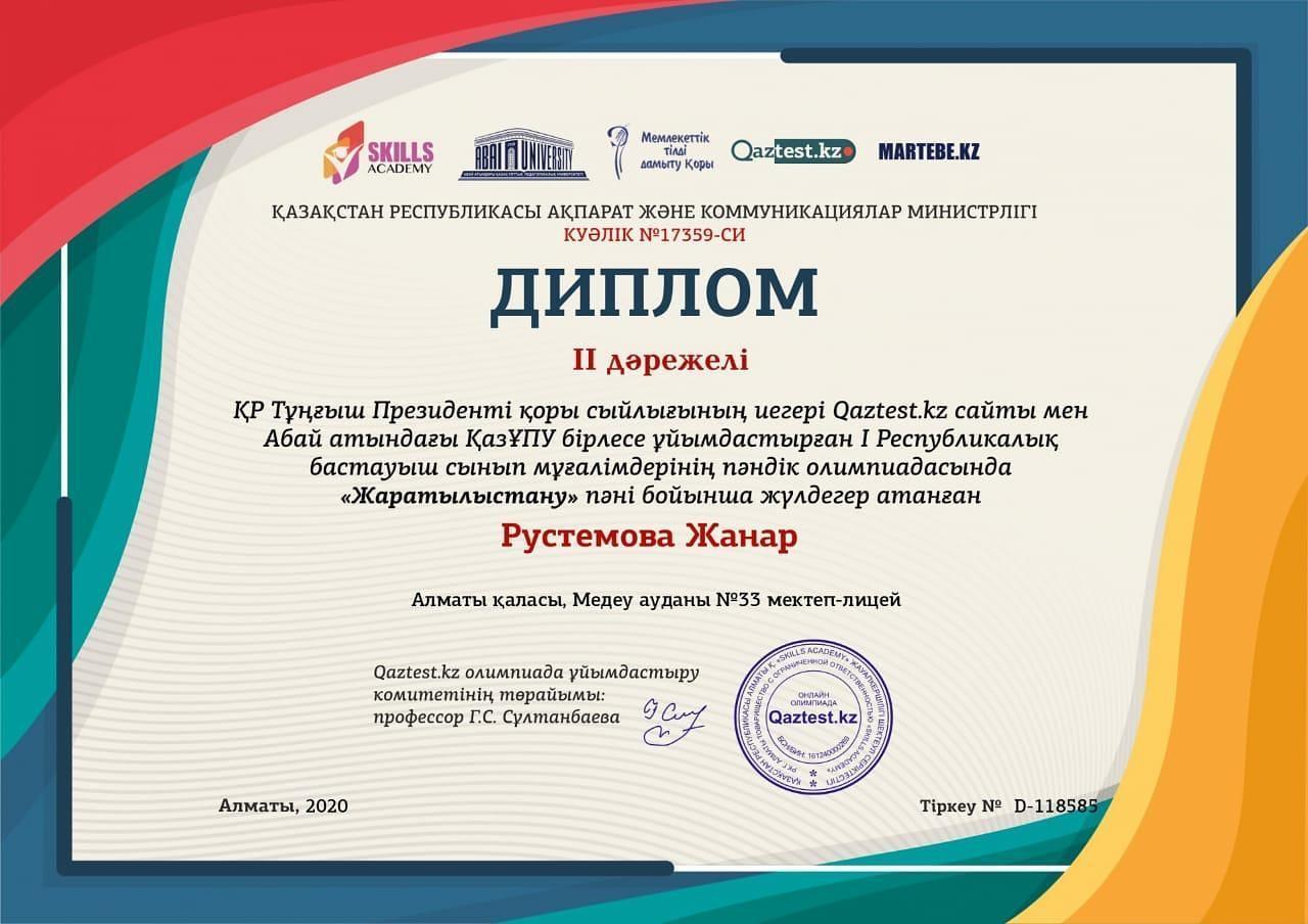 ҚР Тұңғыш Президенті қоры сыйлығының иегері Qaztest.kz сайты мен Абай атындағы ҚазҰПУ бірлесе ұйымдастырған І Республикалық бастауыш сынып мұғалімдерінің пәндік олимпиада "Жаратылыстану" пәні бойынша мектебіміздің білікті ұстазы Рустемова Жанар Нугмаровна ІІ дәрежелі дипломмен марапатталды! Құттықтаймыз 💐