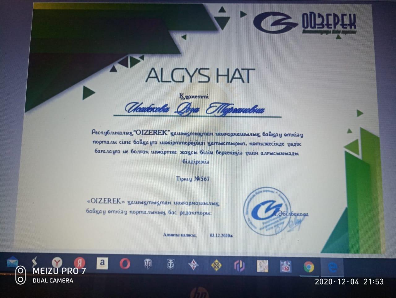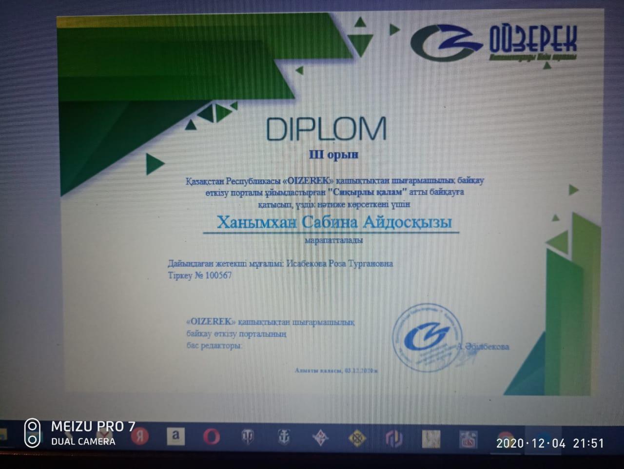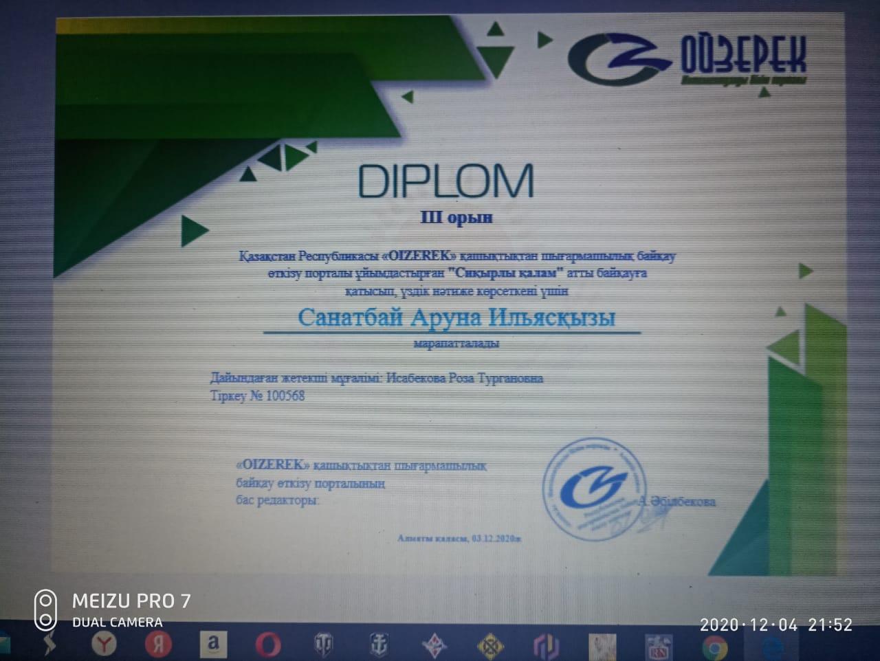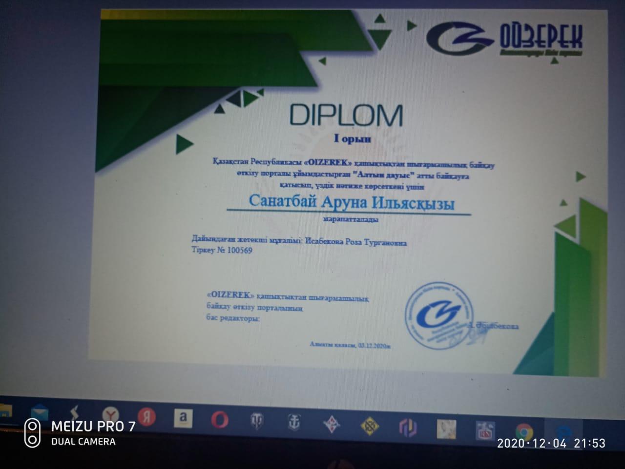 Қазақстан Республикасы “Oizerek” қашықтықтан шығармашлық байқау өткізу порталы ұйымдастырған “Алтын дауыс” атты байқауға қатысып үздік нәтиже көрсеткені үшін 4 “Б” сынып оқушысы Санатбай Аруна І-орын, “Сиқырлы қалам” номинациясы бойынша Ханымхн Сабина ІІІ-орынға ие болды! Жетекшісі: Исабекова Роза Тургановна. Құттықтаймыз💐💐💐