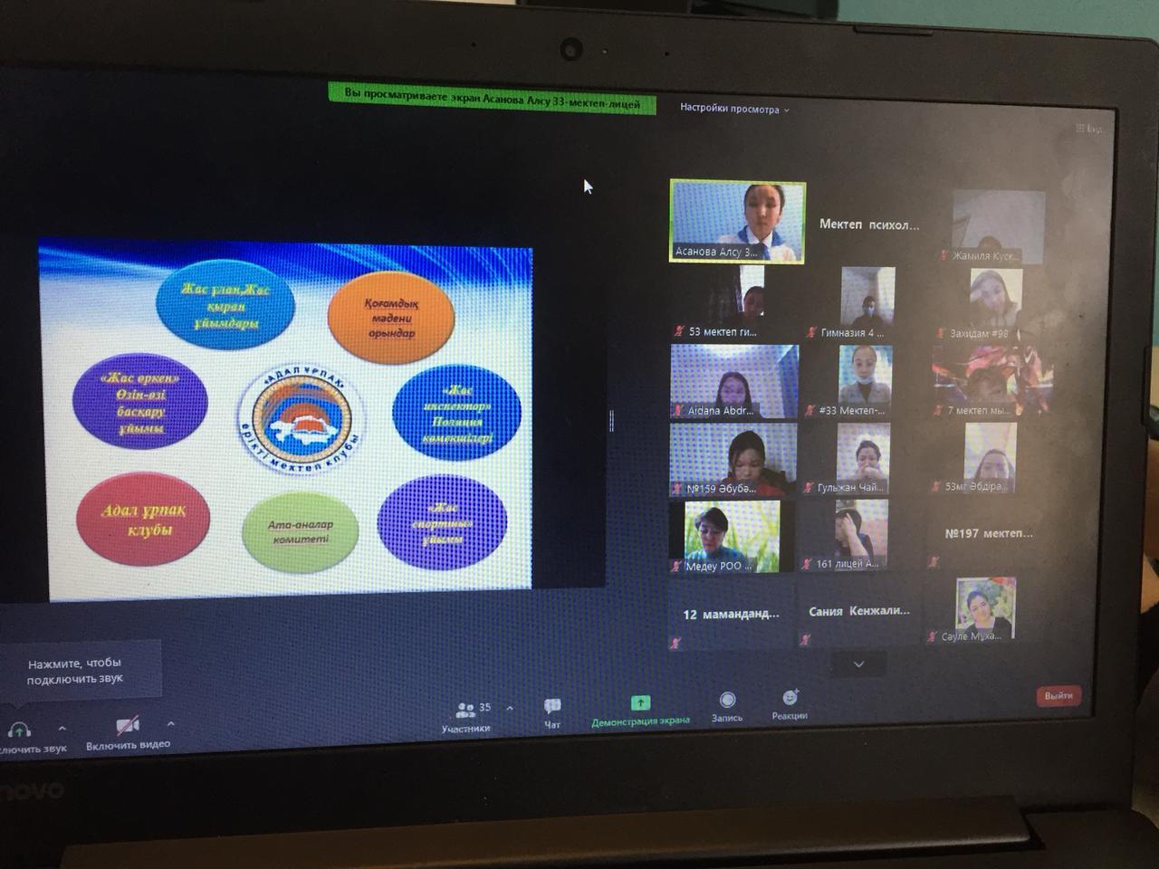 Халқының мүддесін өз мүддесінен артық қоятын, адалдық, бауырмалдық, адамгершілік сынды асыл қасиеттерді бойына жинай білген тәрбиелі ұрпақ тәрбиелеу- барлығымыздың борышымыз. Осыған орай бүгін 27.01.2020ж күні Медеу аудандық білім бөлімінің басшысы Сапарова Ағайша Амировна және 33 мектеп-лицей тәлімгері Бектұрған Аяжан Ұланқызы мен ДТІЖО Қыдық Ақерке Алханбайқызының ұйымдастыруымен Медеу ауданы мектептерінің ұланбасыларымен директордың тәрбие ісі жөніндегі орынбасарларының қатысуымен «Адал ұрпақ – мәңгілік елдің кепілі!» тақырыбында аудандық онлайн-конференция өткізілді. Онлайн-конференцияда Медеу аудандық білім бөлімінің әдіскері Акылбаева Эльмира Нургазиновна сөз бастап конференцияның өткізілу барысымен таныстырды. Мектебіміздің «Адал ұрпақ» еріктілер клубының көшбасшысы Асанова Алсу жалпы мектептердегі «Адал ұрпақ» еріктілер клубының жұмыс істеу мақсаты, міндеттері, ережелері мен бағыттары және мектепте қандай қызмет атқаратыны жөнінде ақпарат беріп, ұланбасыларына сұрақтар қойып жеке ойларын білдіруге шақырды.