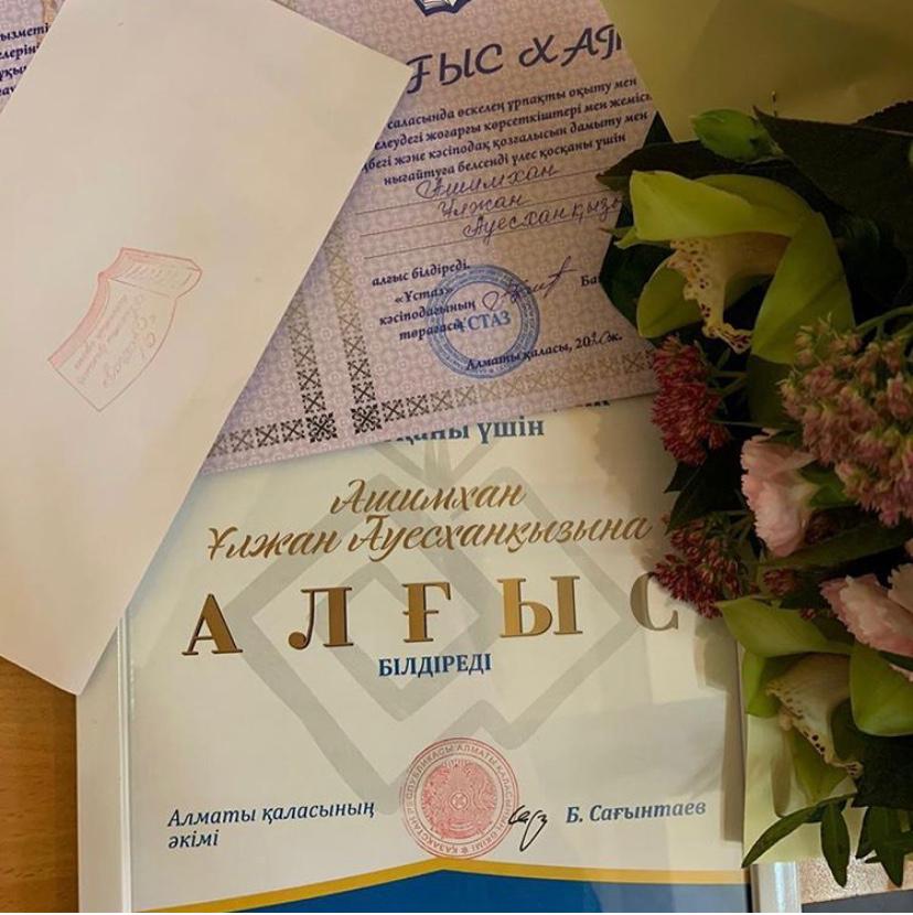 Білім саласында өскелең ұрпақты тәрбиелеудегі жоғарғы көрсеткіштері мен жемісті еңбегі үшін мектебіміздің биология пәні мұғалімі, білікті ұстаз Ашимхан Ұлжан Әуесханқызы Алматы қаласының әкімі Б.Сағынтаев мырзаның және “Ұстаз” кәсіподақ ұйымының алғыс хатымен марапатталды! Құттықтаймыз 💐💐💐