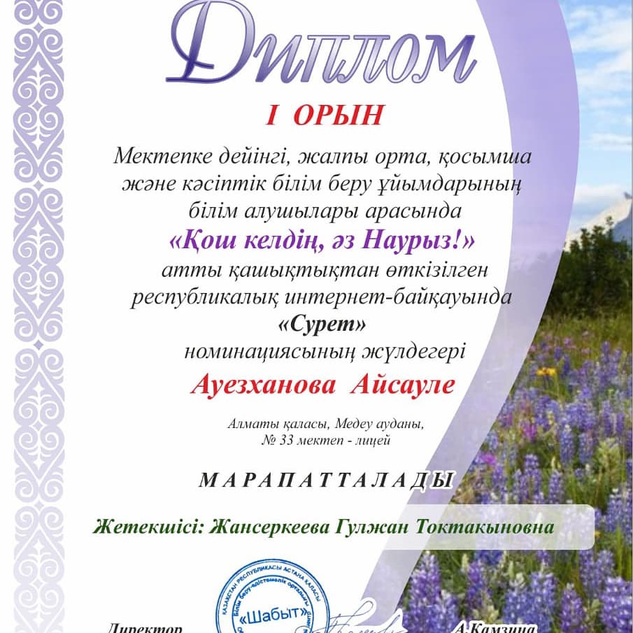 Мектепке дейінгі, жалпы орта, қосымша және кәсіптік білім беру ұйымдарының білім алушылары арасында "Қош келдің, әз Наурыз!" атты қашықтықтан өткізілген республикалық интернет-байқауында "Сурет" номицасы бойынша мектебіміздің 3 "А" сынып оқушылары Ауезханова Айсауле I- орынмен, Мамаева Дана мен Қойшиев Заманбек II - орындарды иеленді! Құттықтаймыз 💐