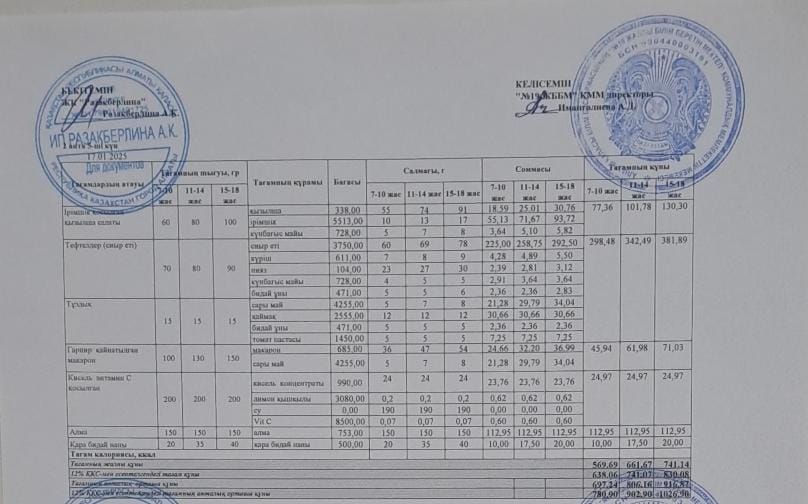 Күнделікті тегін тамақтану мәзірі (17.01.2025)