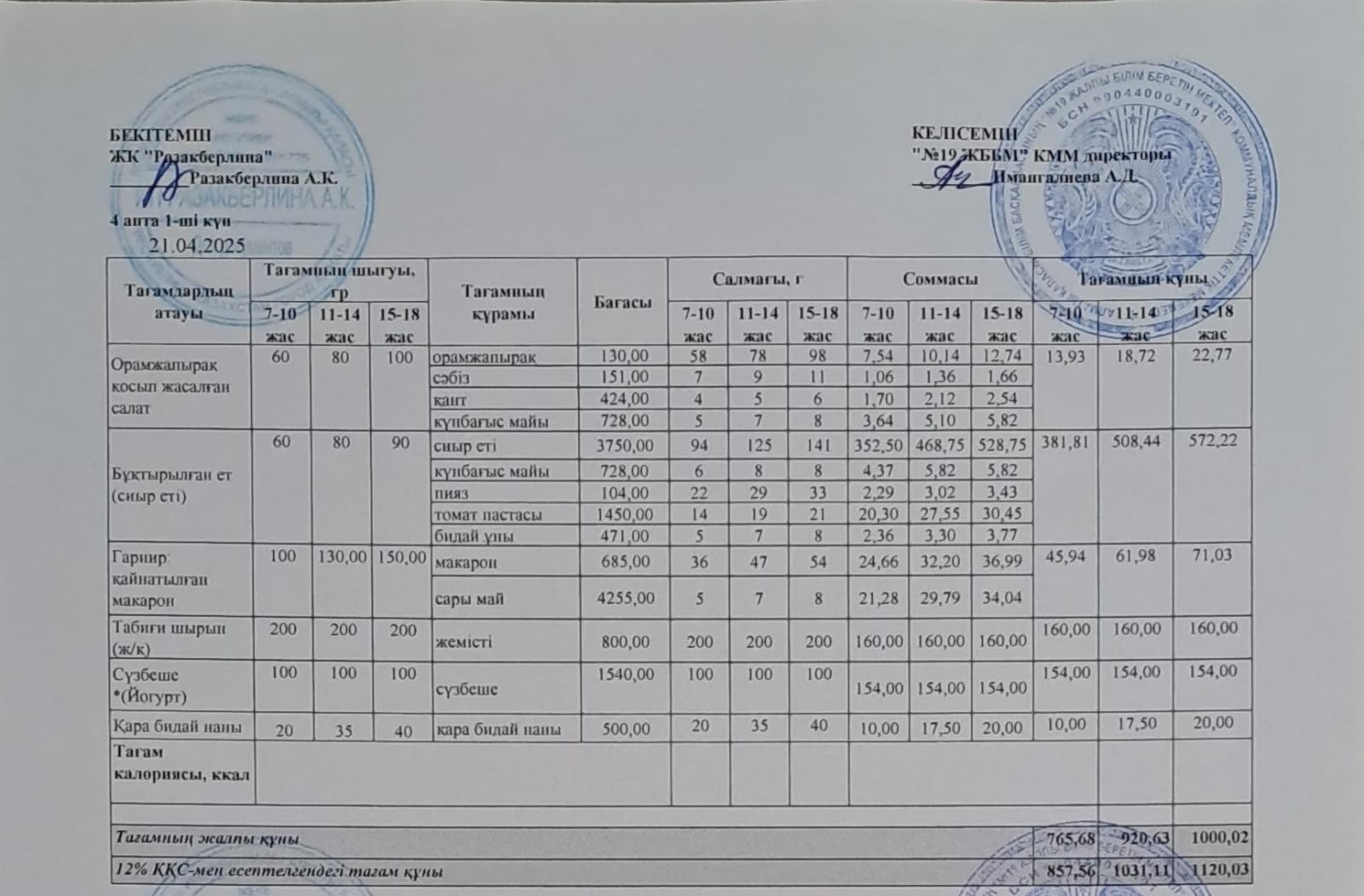 Күнделікті тегін тамақтану мәзірі (21.04.2025)
