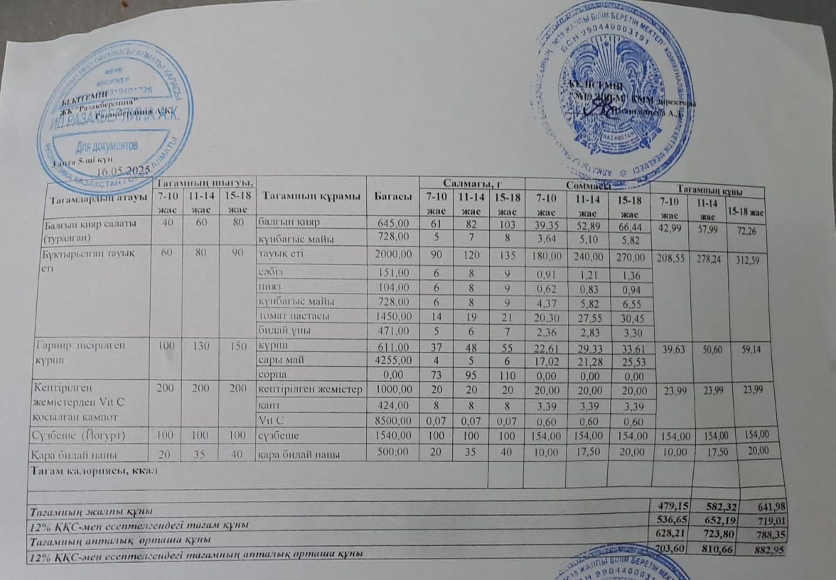 Күнделікті тегін тамақтану мәзірі (16.05.2025)