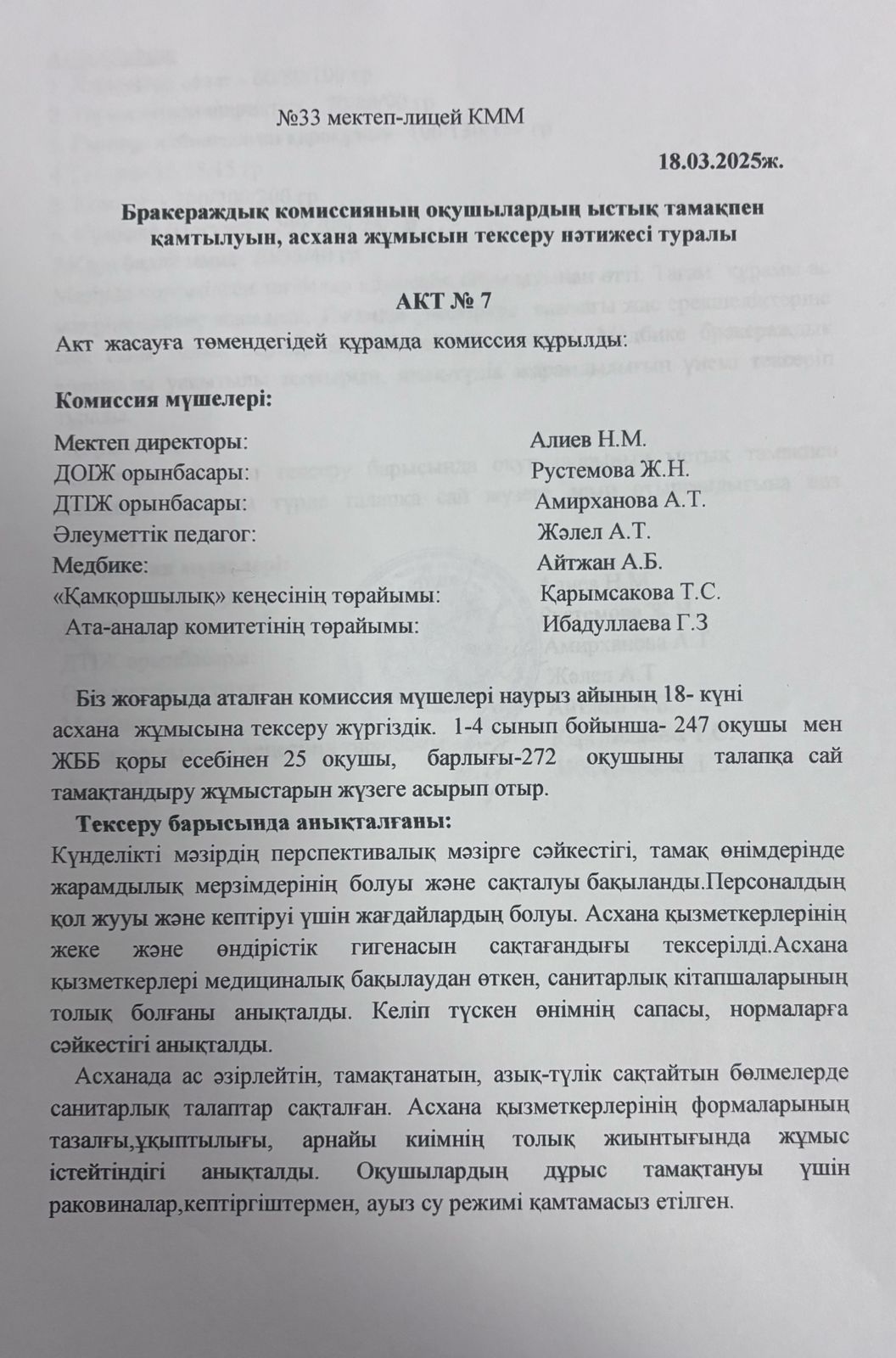 18 март 2025 0 1 2 3 4 5 Бракеражды комиссия мүшелері 18.03.2025 жылы кезекті тексеру жұмысын жүргізді.