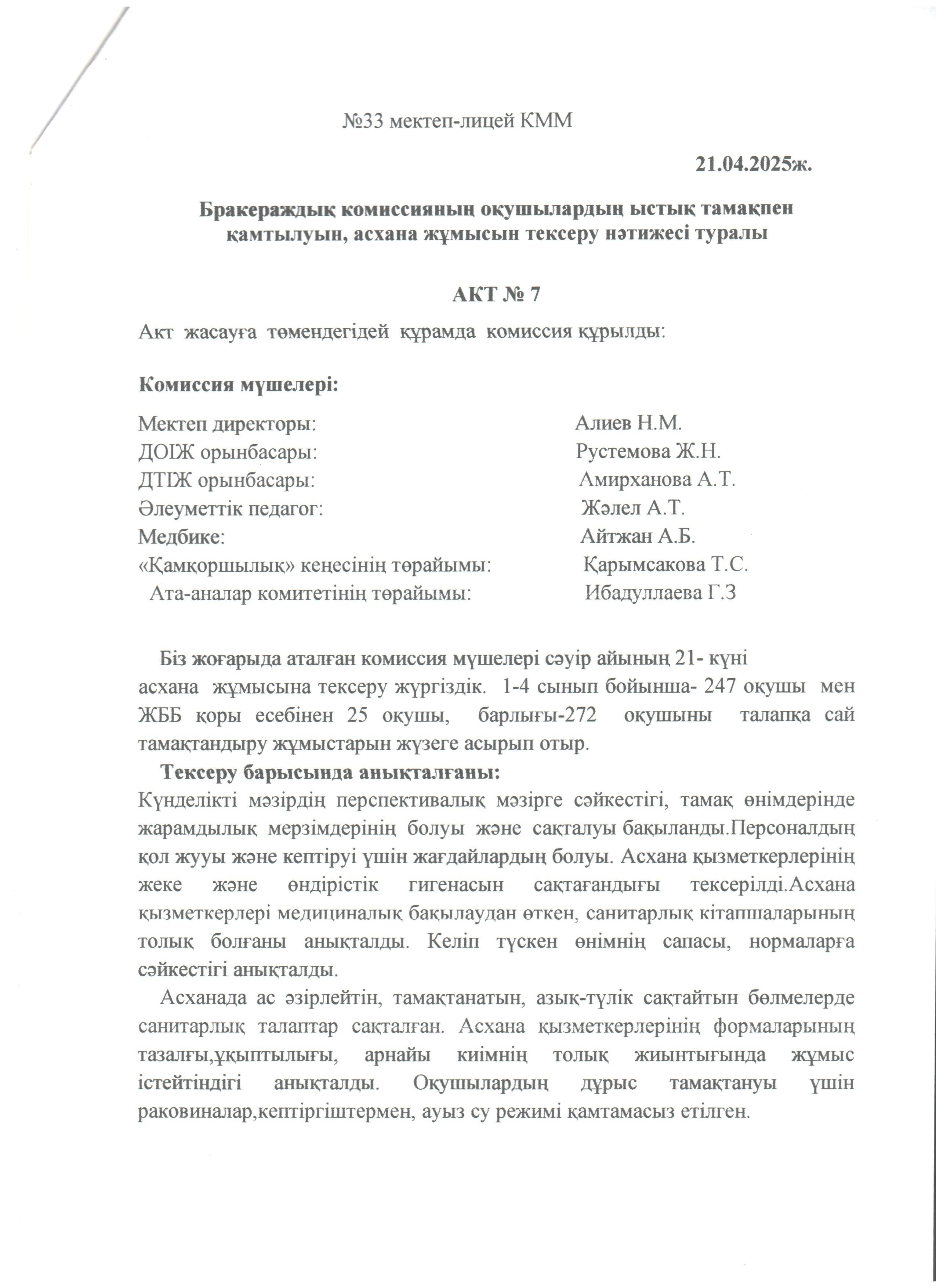 21 апрель 2025 0 1 2 3 4 5 Бракеражды комиссия мүшелері 21.04.2025 жылы кезекті тексеру жұмысын жүргізді.