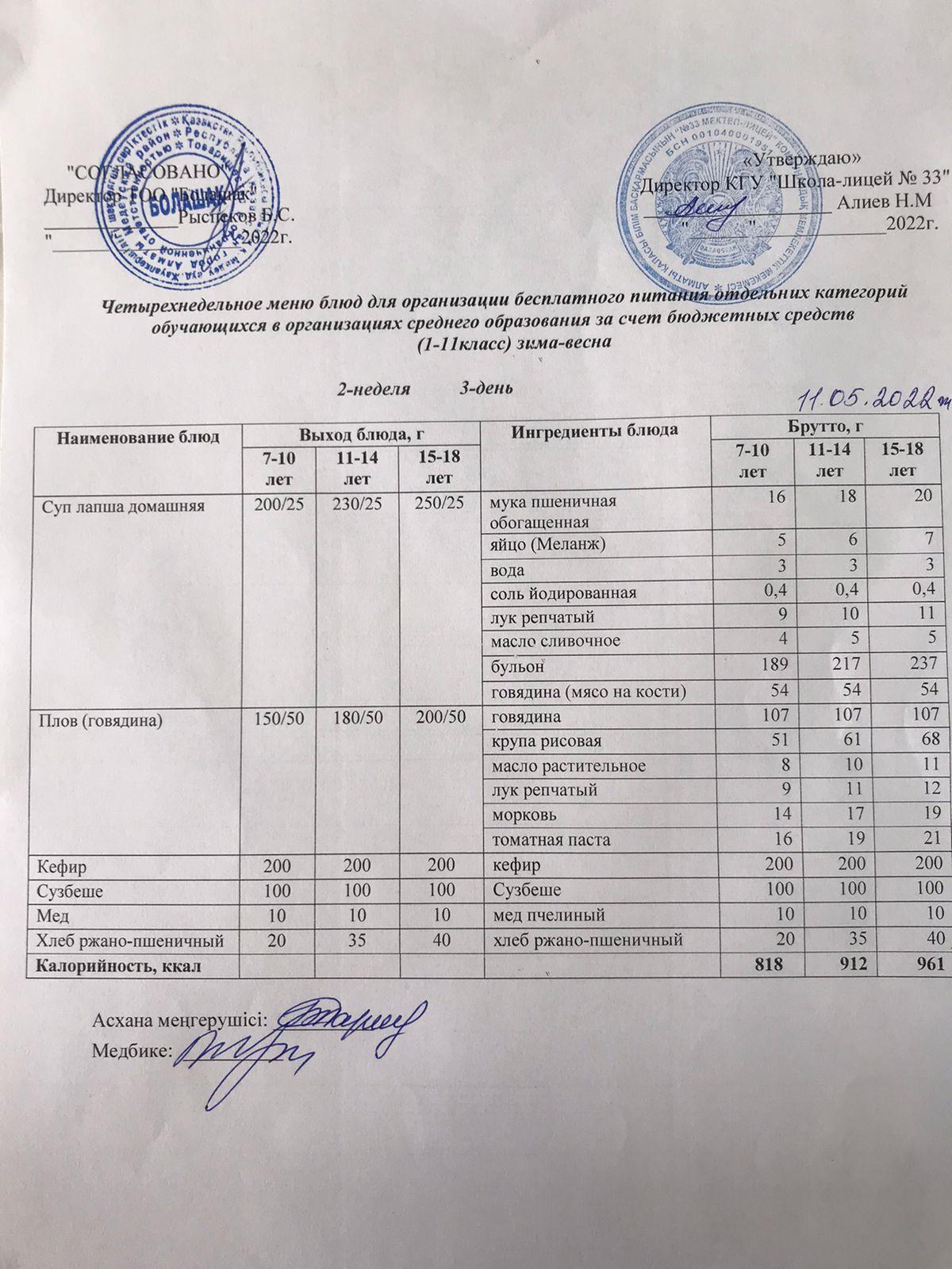 Ас мәзірі 2 апта 1 күн
