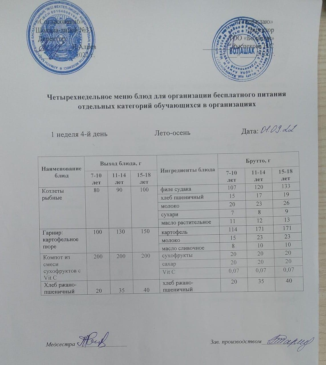 » Ас мәзірі.Жаз-күз 1-ші апта, 4-ші күн